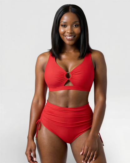 The Amalfi High Rise Bikini Set combines flattering design and modern style to elevate your swimwear collection. Featuring a deep V-neck triangle top with metal accent hardware and adjustable drawstring high-rise bottoms, this set offers a tailored fit and enhanced silhouette. The high-rise cut and butt-lifting triangle design work together to accentuate curves while providing a chic, contemporary beach look — perfect for pool days, tropical holidays, or seaside getaways.