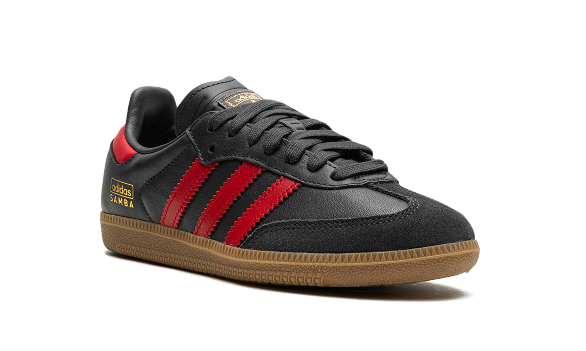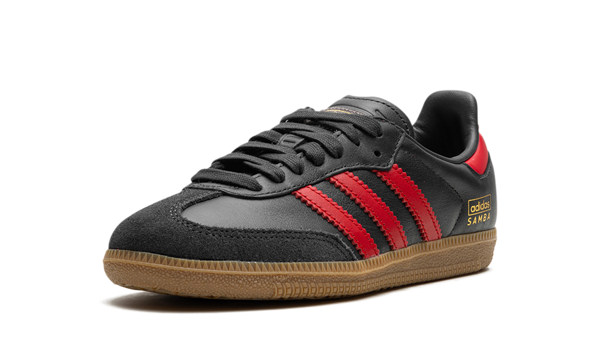 The adidas Samba OG “Carbon/Better Scarlet” is a mostly two-tone, black-and-red colorway of the classic shoe. The adidas Samba originated as a performance soccer shoe before becoming one of the most popular lifestyle sneakers in the world in the present day. On the “Carbon/Better Scarlet,” the upper has a Carbon leather construction with a tonal suede overlay on the toe. Better Scarlet-colored leather Three Stripes branding appears on both sides. Additional Better Scarlet detailing appears on the leather heel tab. A gold “adidas Samba” logo is stamped on the lateral side of the heel. A gum rubber sole completes the look.