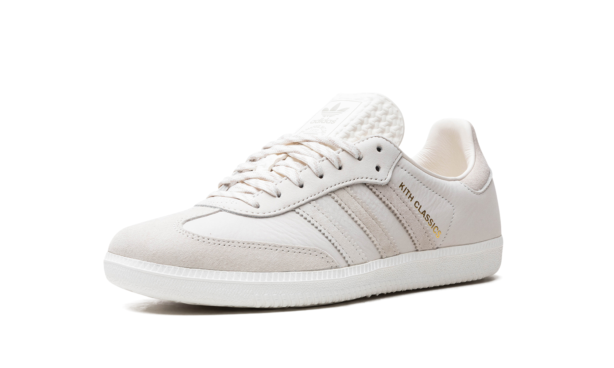 The Kith x adidas Samba “Classics Program - Cloud White” is a collaboration by Ronnie Fieg’s sneaker boutique on the popular sneaker. The upper features a Cloud White leather construction with Orbit Grey suede overlays on the toe and heel tab. Additional Orbit Grey suede can be found on the Three Stripes branding on the sides. A gold “Kith Classics” logo is printed on the lateral side of the mid-panel, and “Kith” and “adidas” branding can be found on the heel of the left and right shoe, respectively. A textured white rubber sole completes the look.