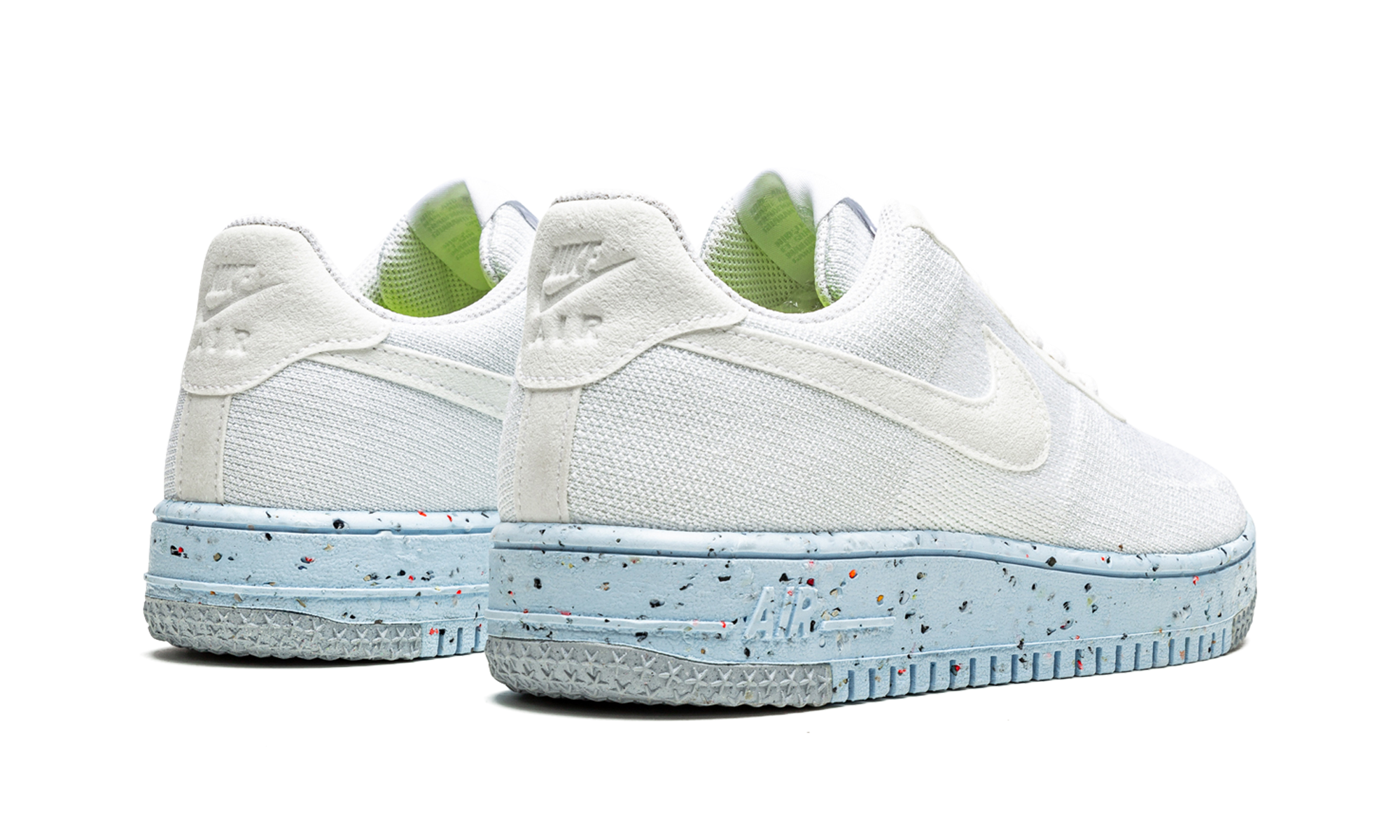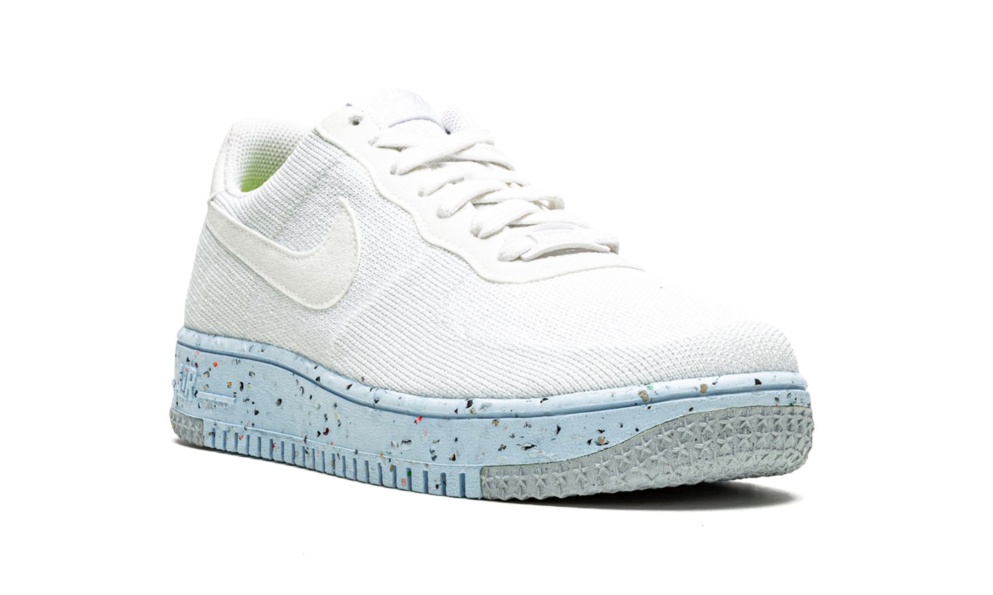 The Women’s Nike Air Force 1 Crater Flyknit “White” is a modern take on the classic basketball shoe that updates the silhouette with environmentally friendly materials. Ultra lightweight, the shoe’s upper is composed of Nike’s Flyknit material that’s both durable and breathable in design. A suede Pure Platinum Swoosh appears on either side and embossed “Nike Air” with a Swoosh branding graces the suede heel tab. The Air Force 1 Crater Flyknit for women rides on a speckled Crater foam midsole that’s composed of Nike’s “Grind” material. White