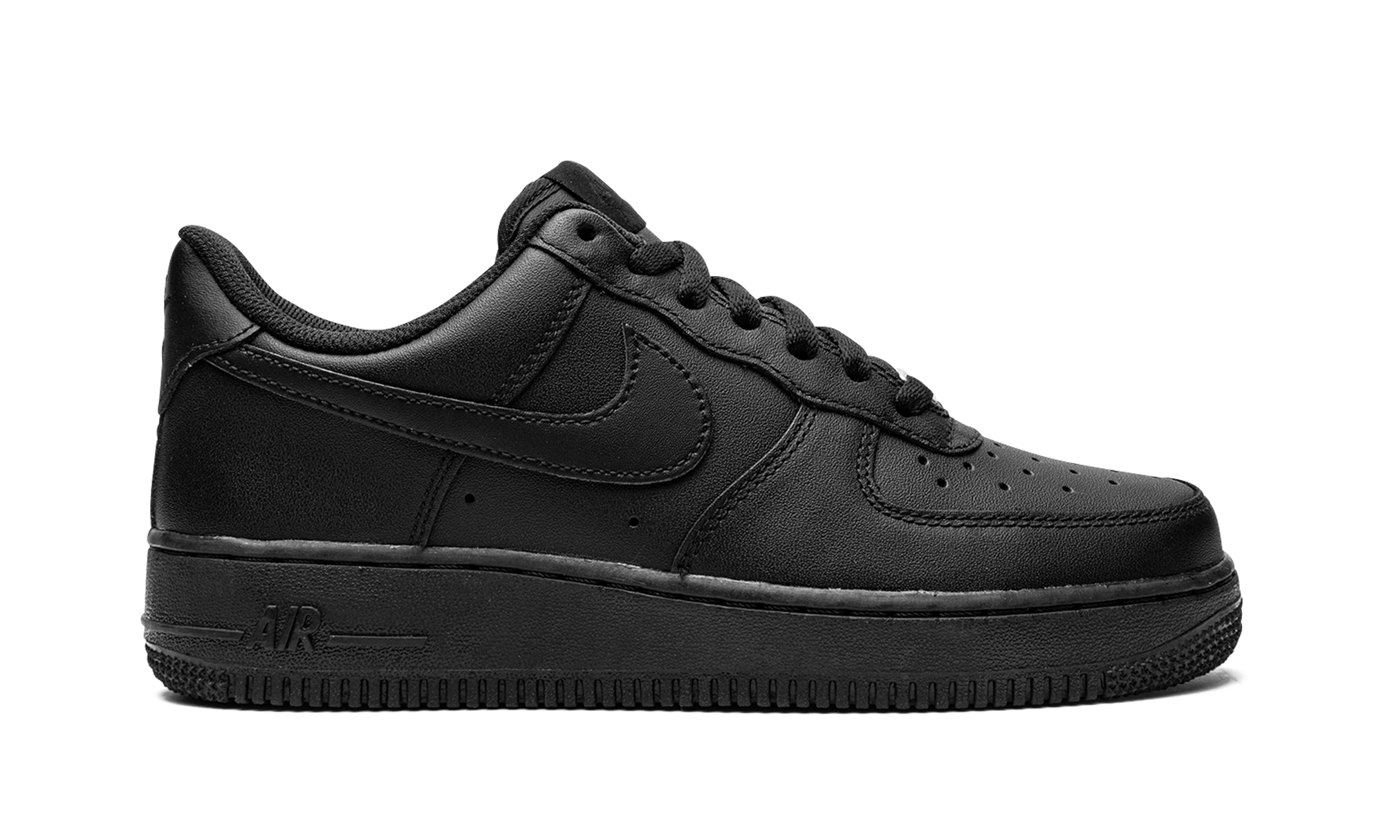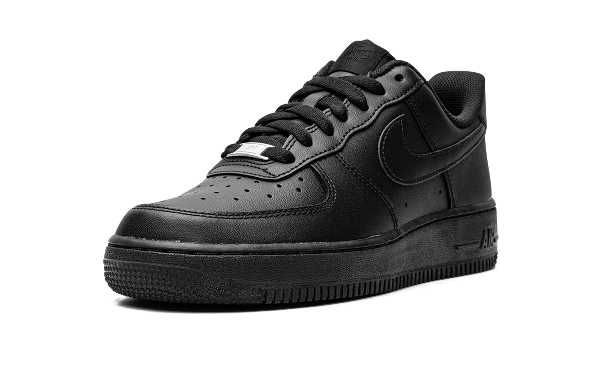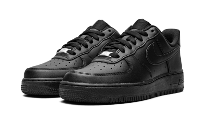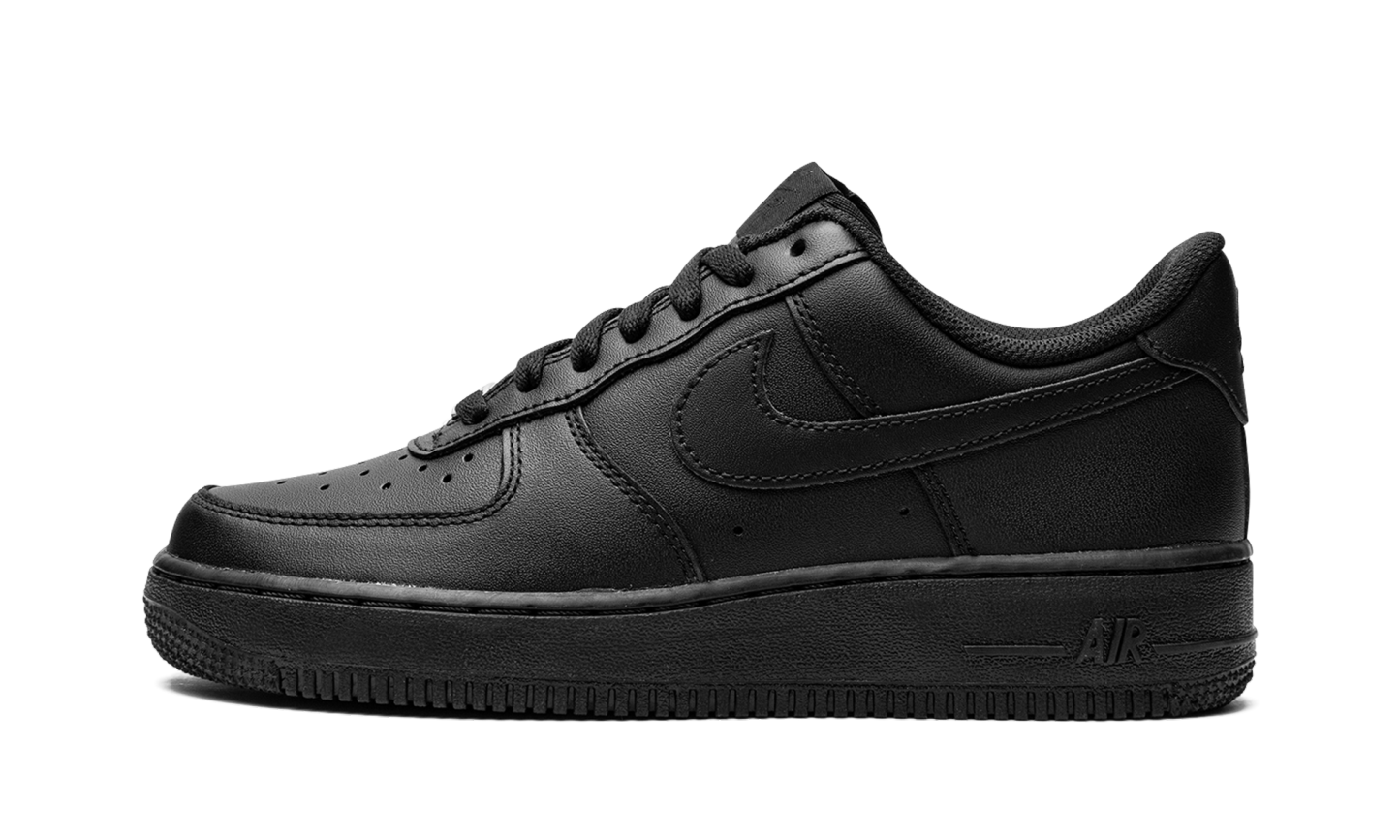 Black leather Air Force 1 '07 sneakers from NIKE featuring signature Swoosh logo detail, round toe, perforated detailing, front lace-up fastening, logo patch at the tongue, branded insole and rubber sole. These styles are supplied by a premium sneaker marketplace. Stocking only the most sought-after footwear, they source and curate some of the most hard to find sneakers from around the world.. Triple Black