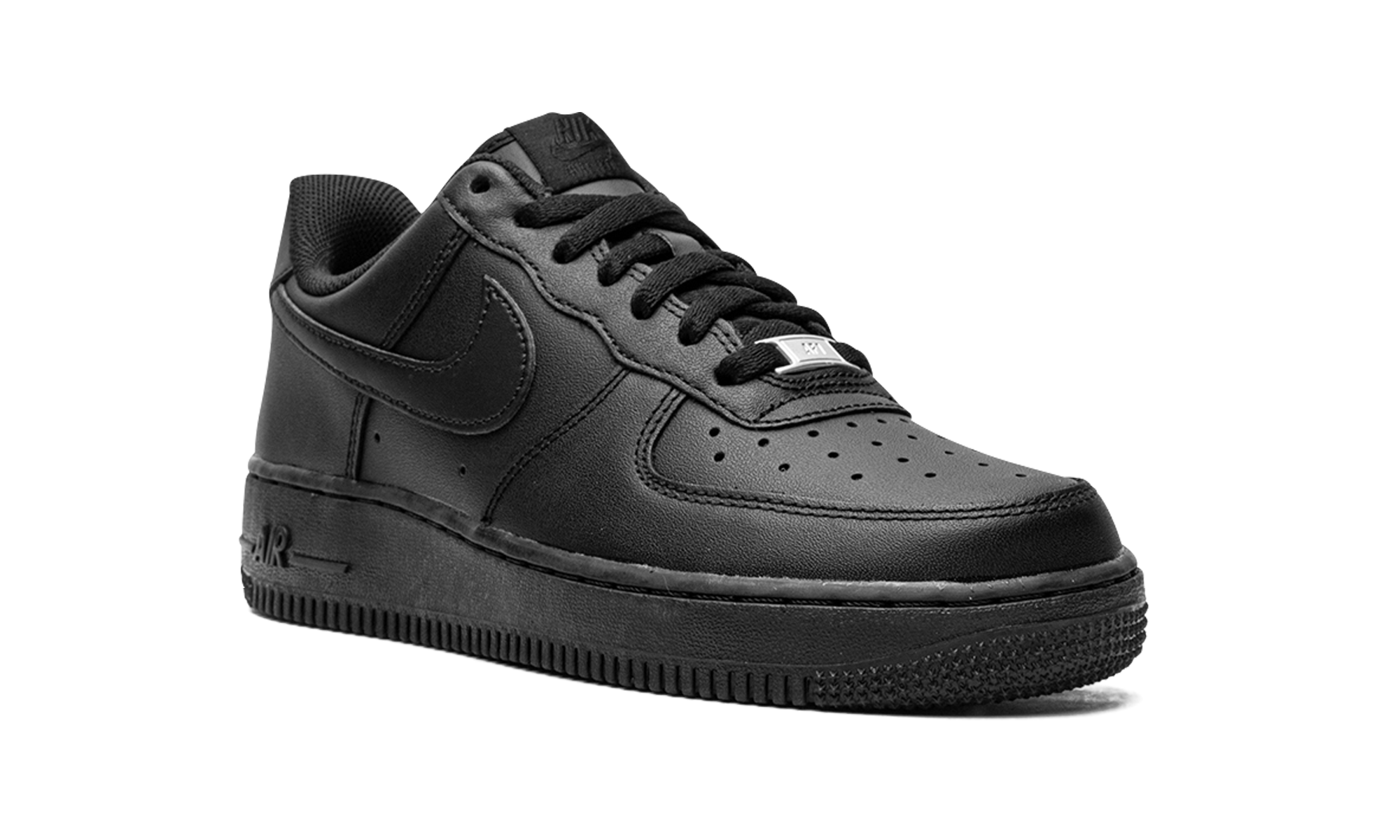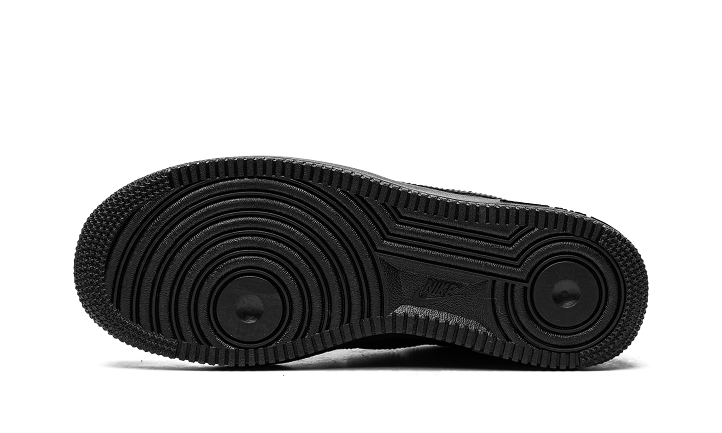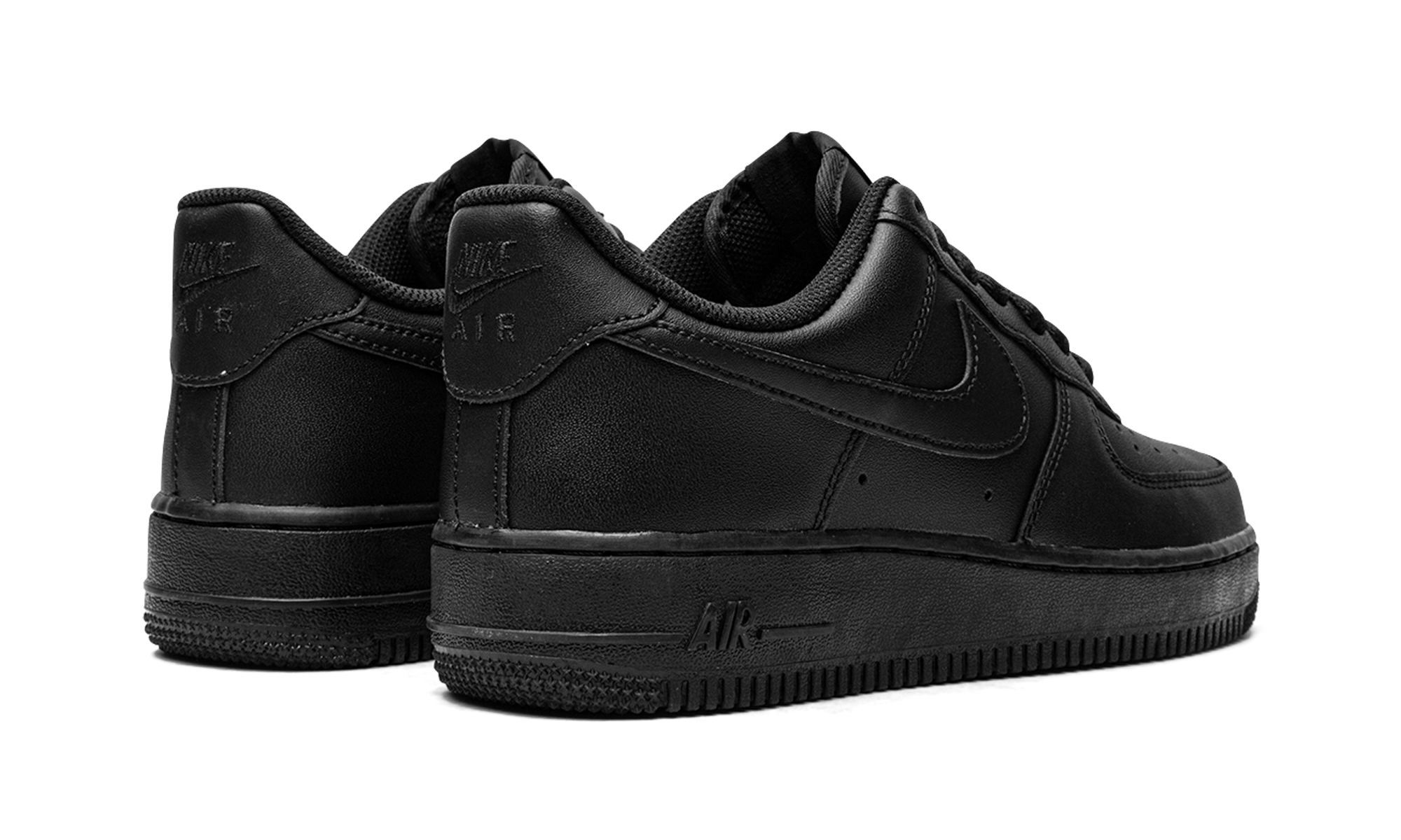 Black leather Air Force 1 '07 sneakers from NIKE featuring signature Swoosh logo detail, round toe, perforated detailing, front lace-up fastening, logo patch at the tongue, branded insole and rubber sole. These styles are supplied by a premium sneaker marketplace. Stocking only the most sought-after footwear, they source and curate some of the most hard to find sneakers from around the world.. Triple Black