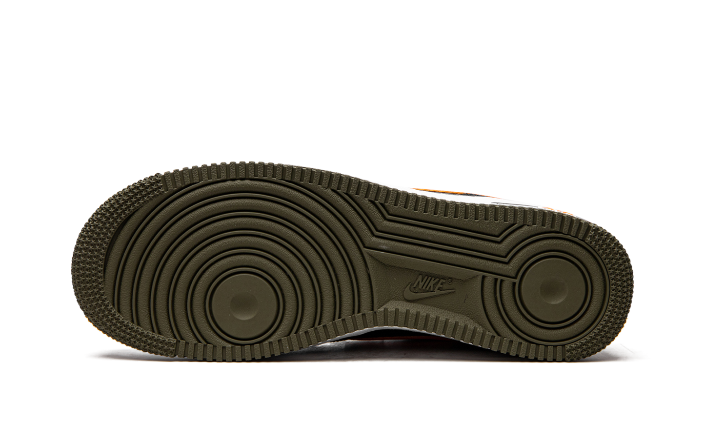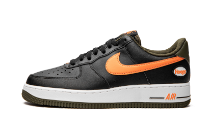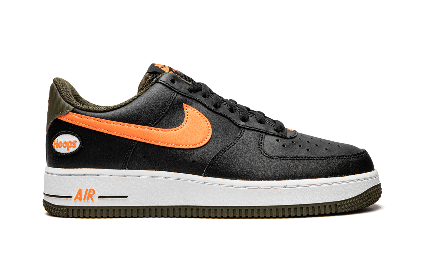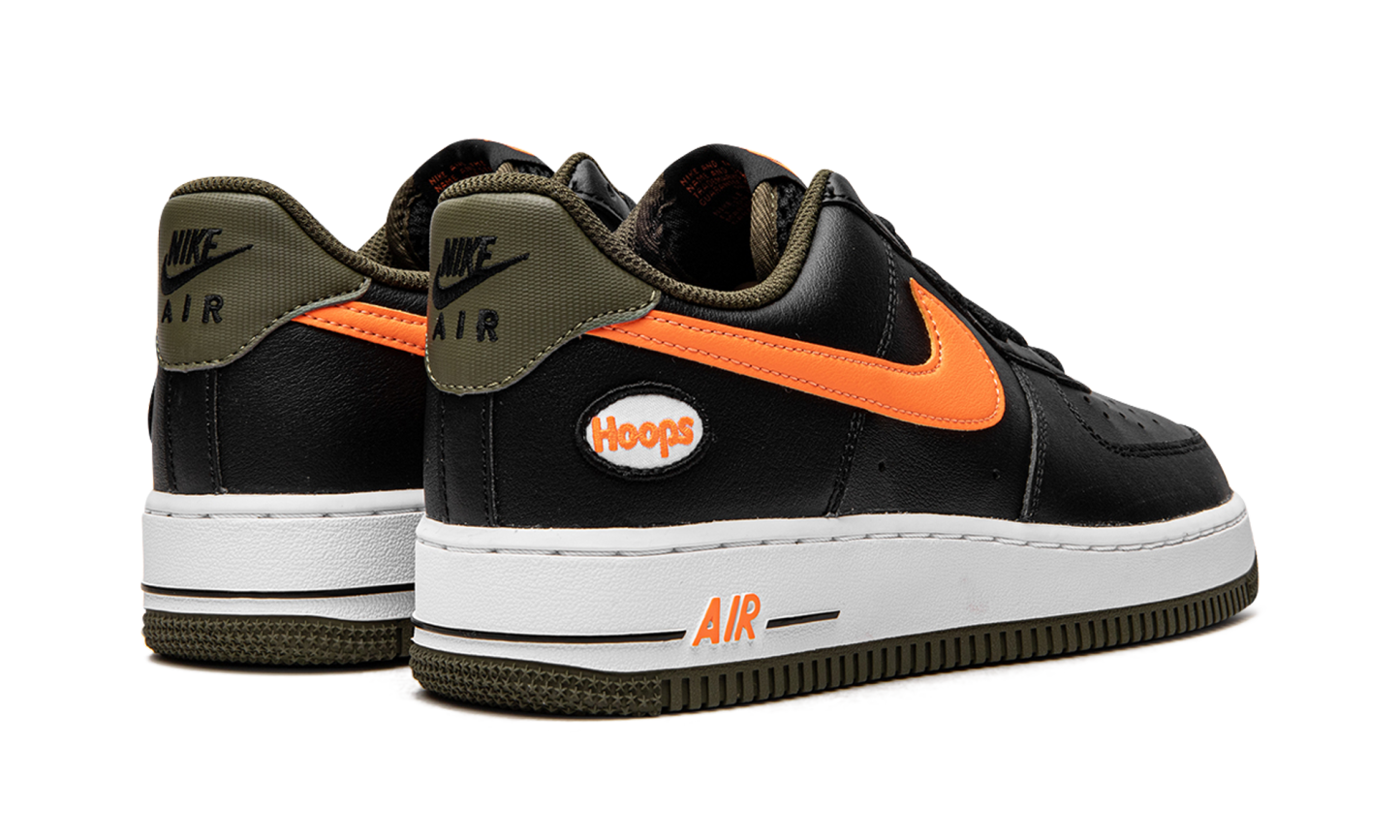The Nike Air Force 1 Low “Hoops - Black/Orange” is a colorway of the classic basketball shoe that celebrates its legacy in the sport. This March 2022 release of the Air Force 1 features a black leather upper that’s contrasted on the sides by a blazing orange leather Swoosh. The word “Hoops” appears within a small circle on the lateral side of the heel. A black “Nike Air” logo is paired with a black Swoosh on the olive green heel tab. Traditional “Nike Air Force 1” branding is printed in orange text on the black mesh tongue. Underfoot, orange “Air” detailing appears on the lateral side of the white rubber midsole. The shoe rides on an olive green outsole. Release date: March 21, 2022 Hoops Black University Gold