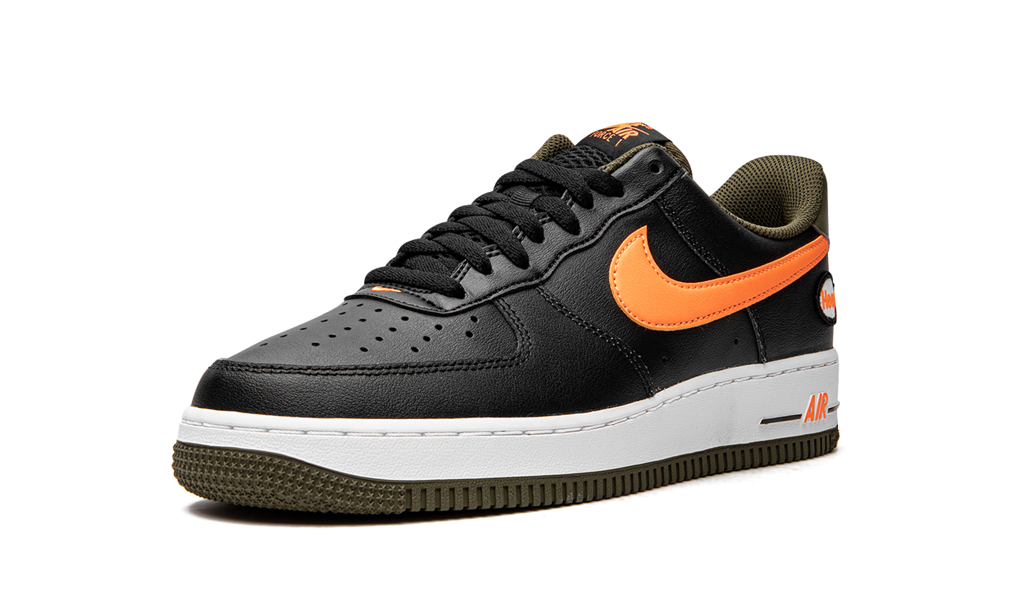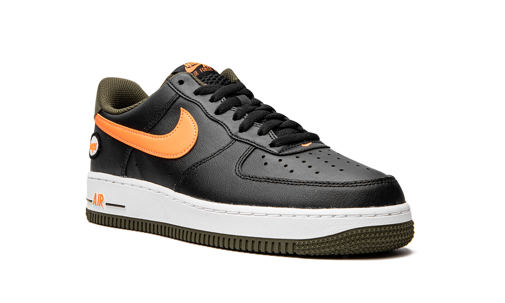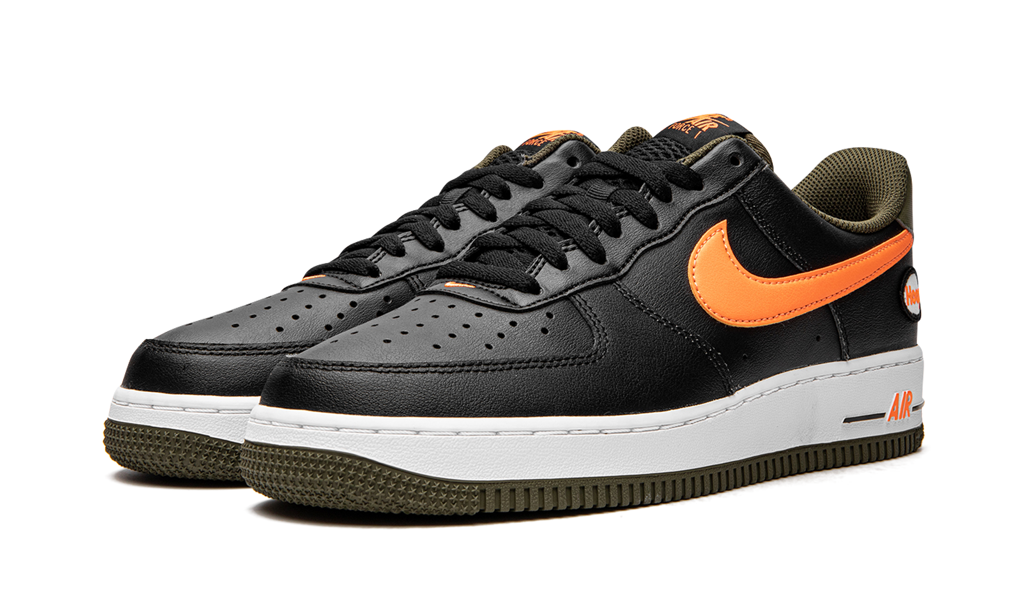 The Nike Air Force 1 Low “Hoops - Black/Orange” is a colorway of the classic basketball shoe that celebrates its legacy in the sport. This March 2022 release of the Air Force 1 features a black leather upper that’s contrasted on the sides by a blazing orange leather Swoosh. The word “Hoops” appears within a small circle on the lateral side of the heel. A black “Nike Air” logo is paired with a black Swoosh on the olive green heel tab. Traditional “Nike Air Force 1” branding is printed in orange text on the black mesh tongue. Underfoot, orange “Air” detailing appears on the lateral side of the white rubber midsole. The shoe rides on an olive green outsole. Release date: March 21, 2022 Hoops Black University Gold