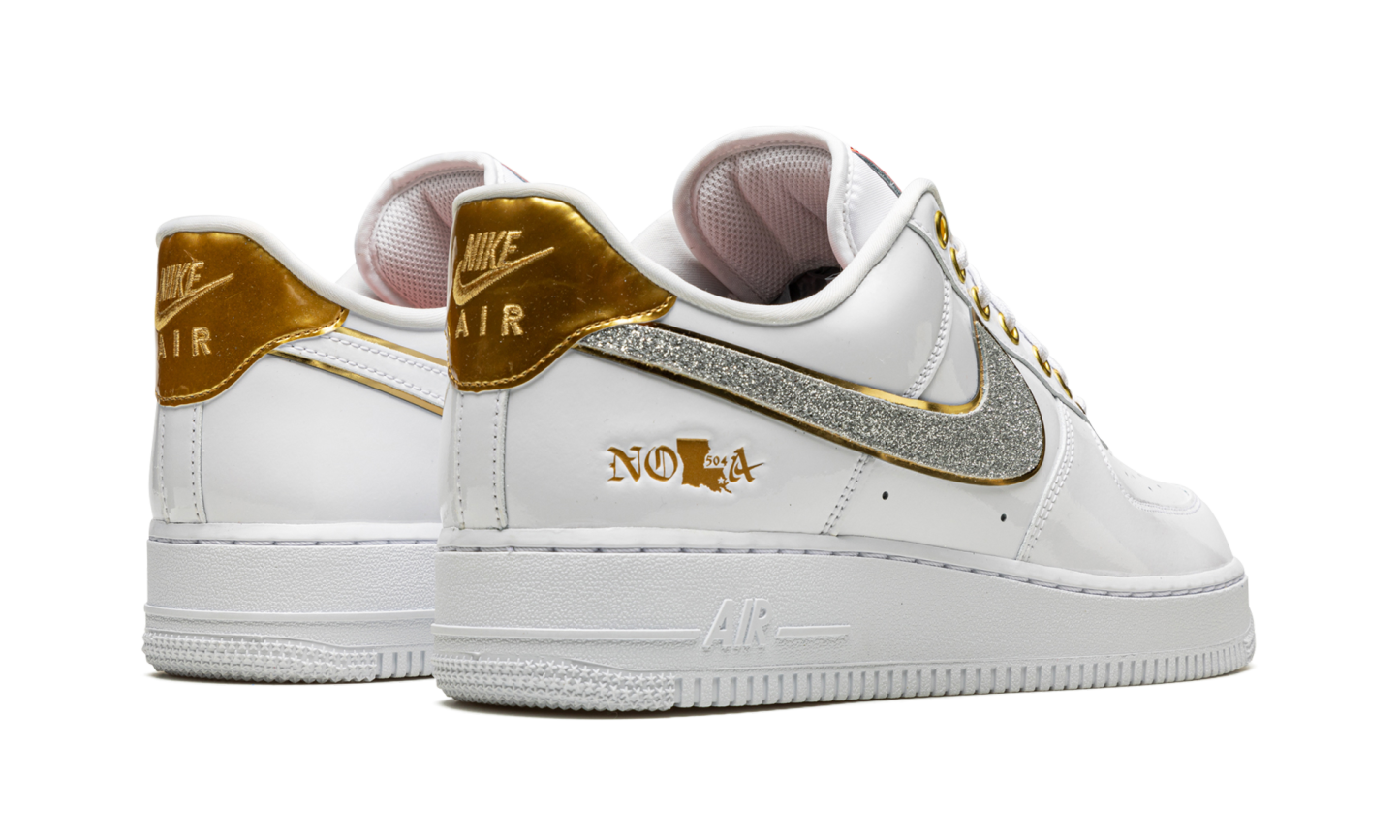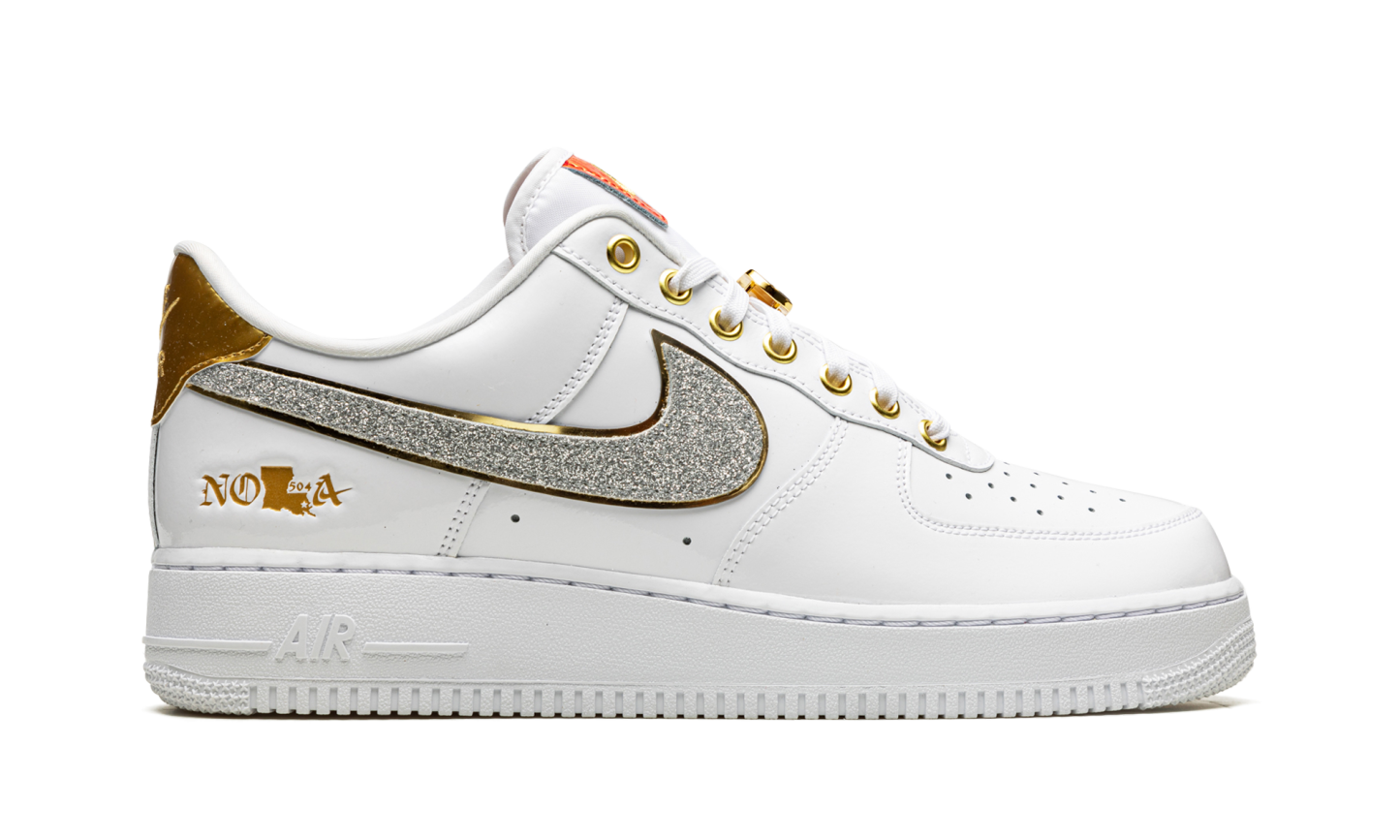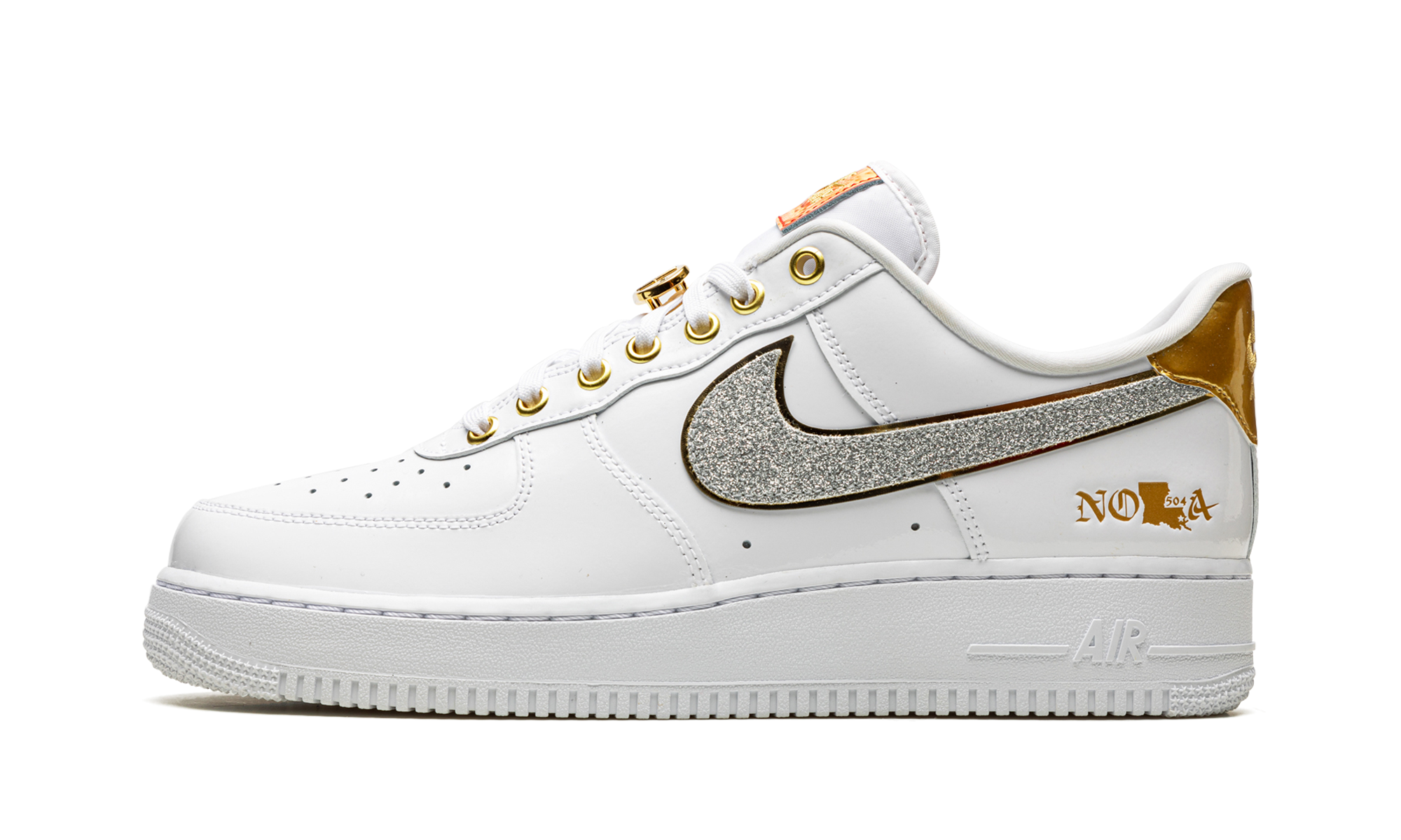 The Nike Air Force 1 Low “NOLA” is a colorway of the popular shoe that celebrates New Orleans’ vibrant culture. Nike celebrated the Air Force 1’s 40th anniversary in 2022 by releasing the shoe in a variety of colorways, including a collection of styles dedicated to cities like Houston and New Orleans. The head-turning design for New Orleans dons a white leather upper with Shimmering Silver Swooshes on the sides that show love to the “Pen & Pixel” style font found on hip-hop album covers by a variety of New Orleans’ rappers. Unique Metallic Gold “NOLA” branding appears on the lateral side of the heel. Additional Metallic Gold accenting is found on the “Nike Air” branded heel tab and “504” lace dubrae. New Orleans is also honored on the tongue tag with a gradient sunrise design. Release date: November 2, 2022 NOLA