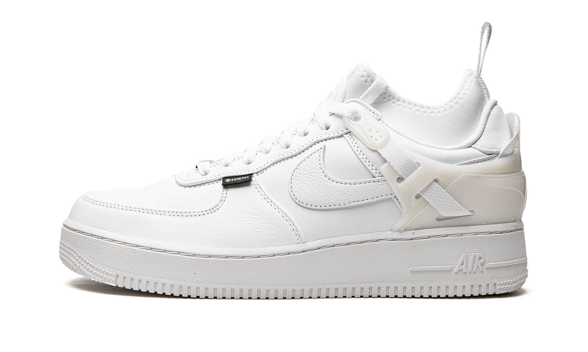 The Undercover x Nike Air Force 1 Low SP “White” is a collaboration between the Japanese streetwear brand and Nike that spins a futuristic take on the retro basketball shoe. Inspired by the Nike ACG Air Revaderchi from 1992, the Undercover co-designed Air Force 1 Low in “White” updates the model’s design with a waterproof Gore-Tex upper, an ACG-style neoprene “bootie” collar and heel counter, and other unique details. The upper is constructed of white leather. A tonal leather Swoosh logo appears on either side of the shoe and a black “Gore-Tex” branded tab is found on the forefoot. The milky TPU “cage” on the heel counter provides stability and is a nod to the design language of the ACG Air Revaderchi. Release date: October 12, 2022 Undercover