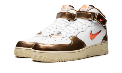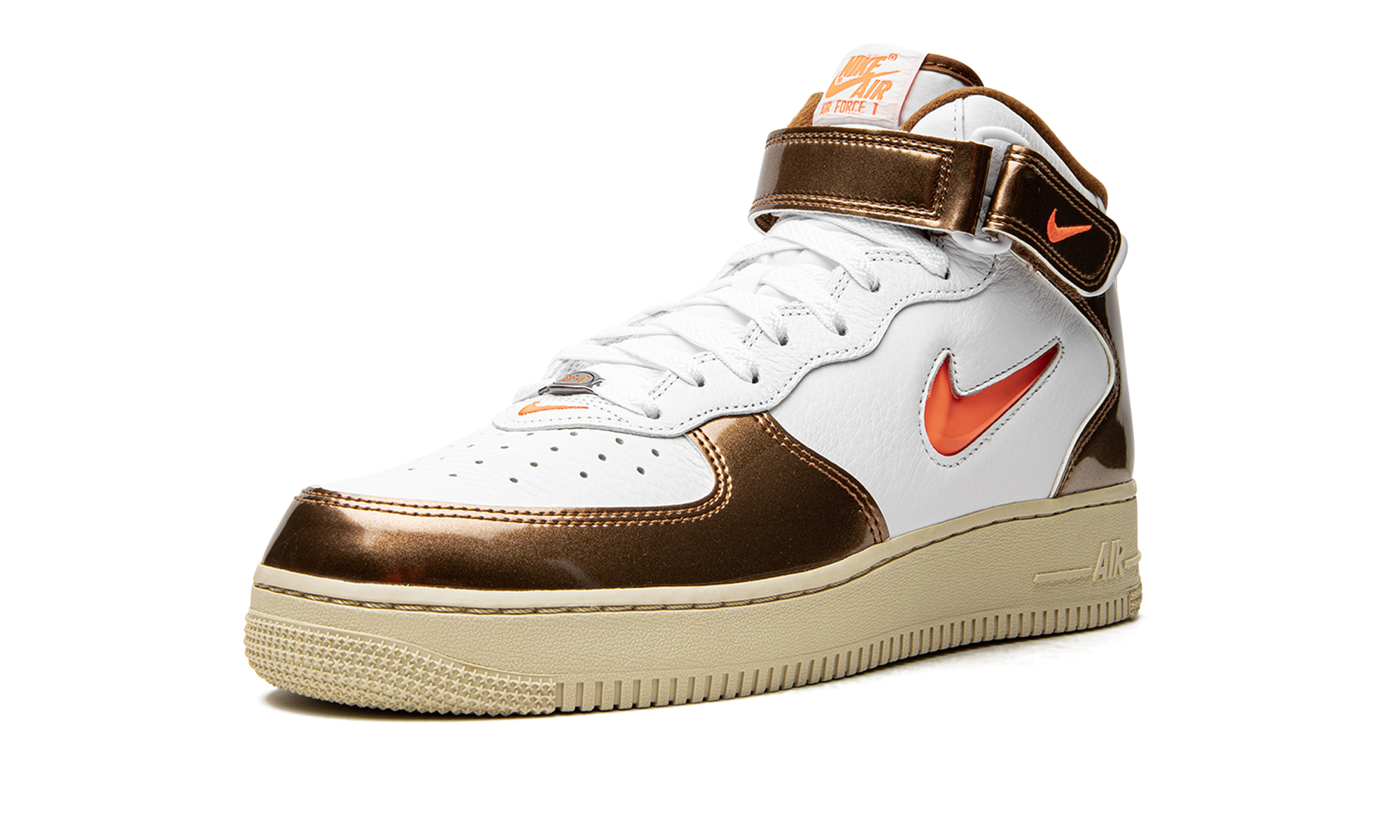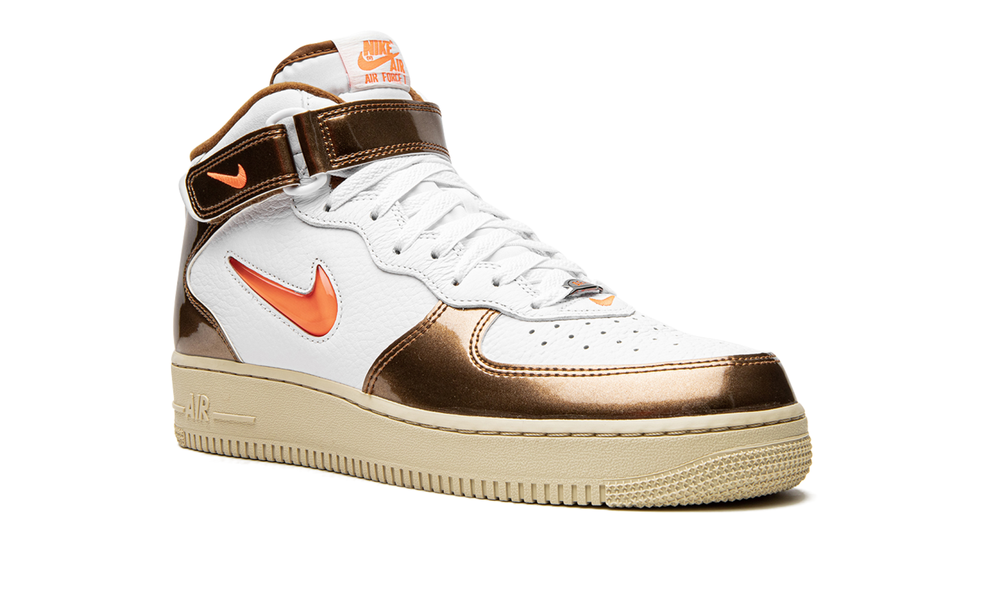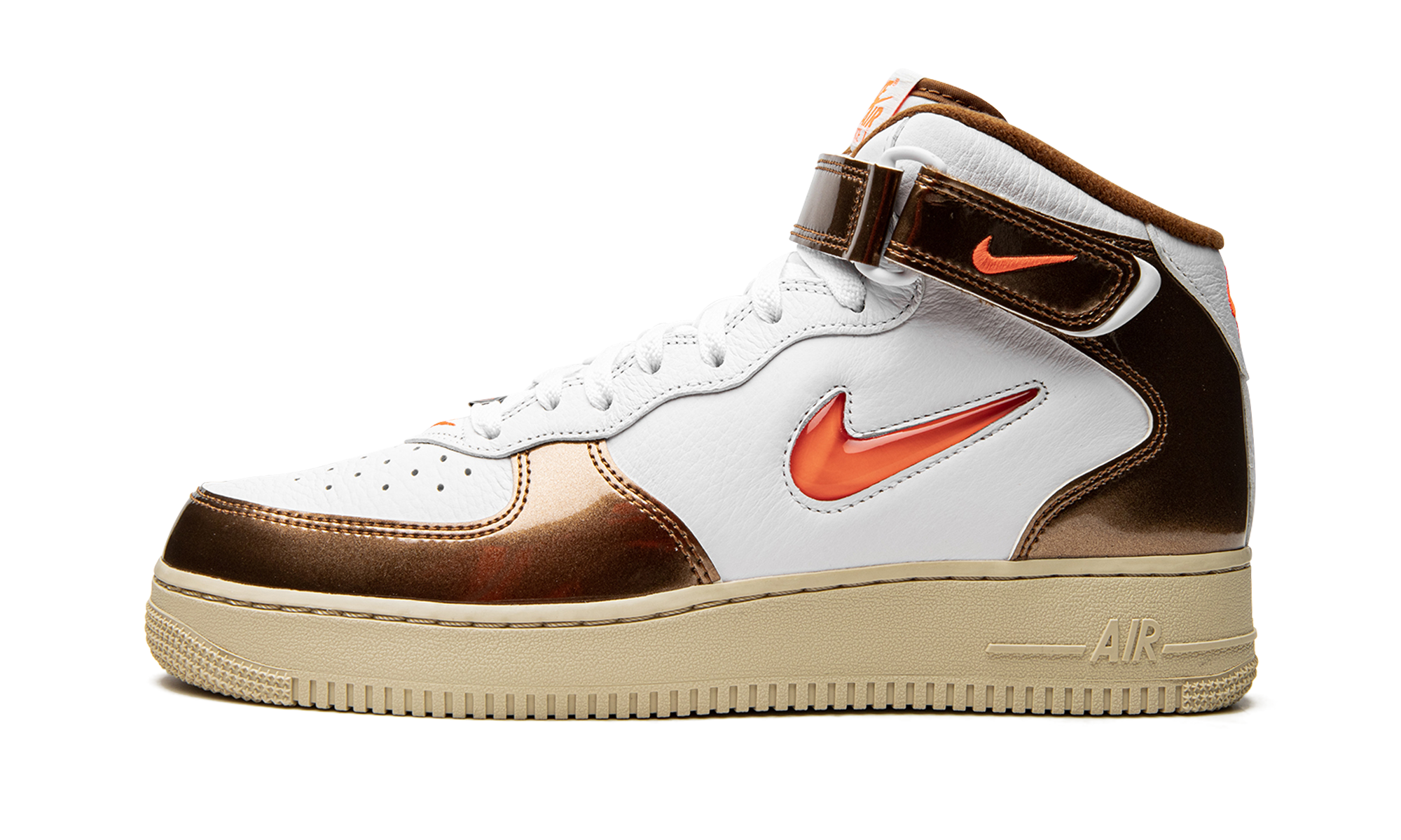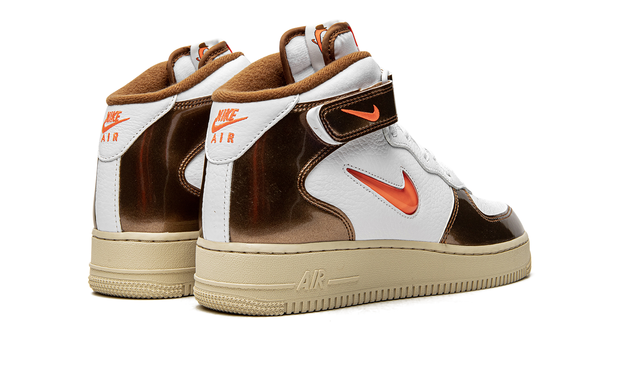 The Nike Air Force 1 Mid Jewel “Ale Brown” is an April 2022 release of the alternate version of the retro basketball shoe that features a jeweled Swoosh, among other design updates. The “Ale Brown” is complete with a white tumbled leather base with contrasting Metallic Ale Brown overlays on the toe cap, forefoot, heel, and adjustable ankle strap. An orange jeweled Swoosh logo is found on both sides of the shoe. An additional orange Swoosh is embroidered on the strap found on the collar. The shoe rides on a cream rubber midsole that gives the colorway a decidedly retro appearance. Release date: April 28, 2022 Ale Brown