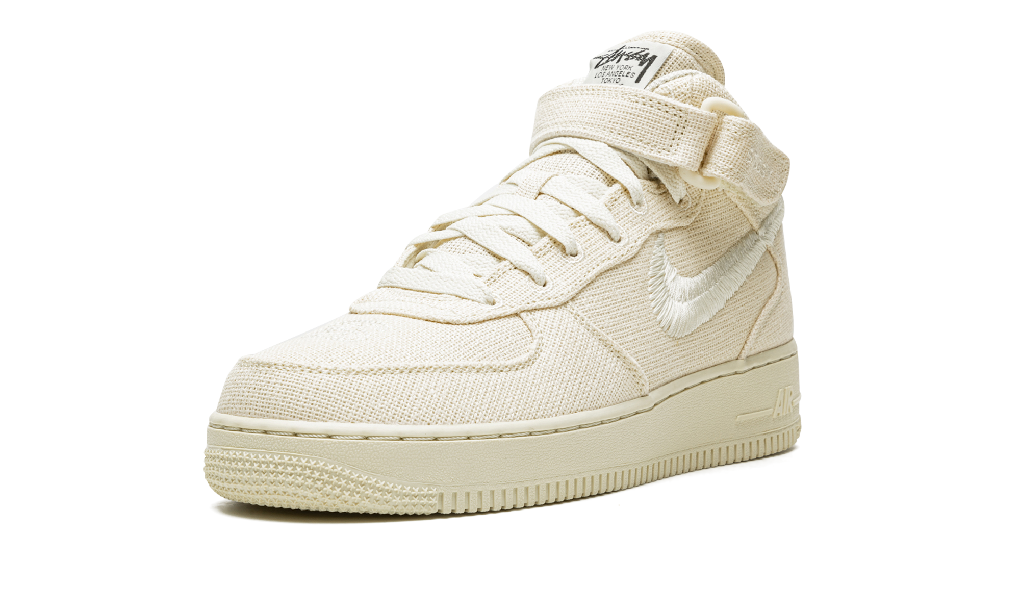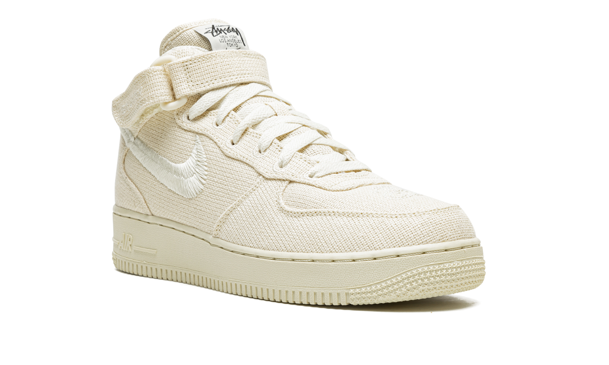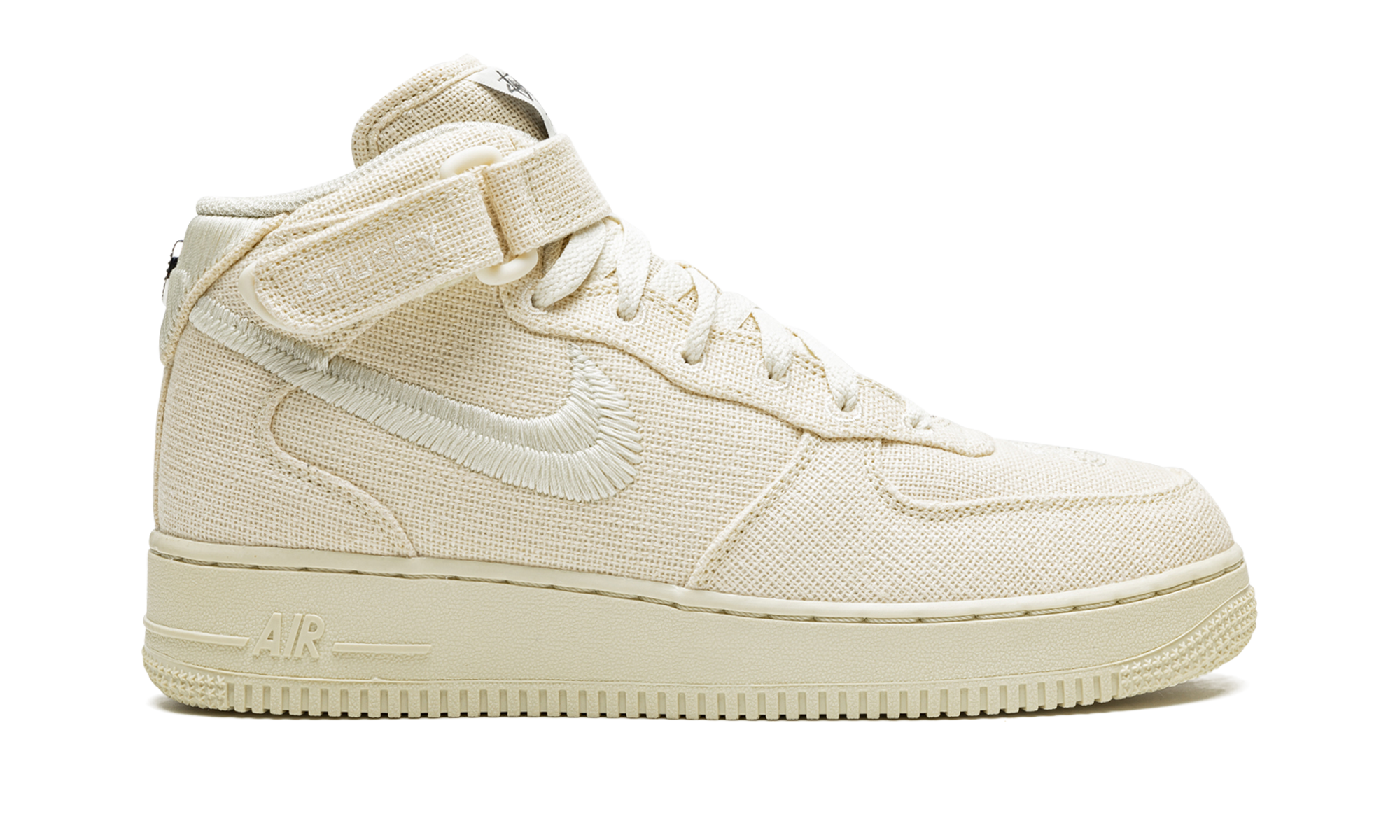 The Stussy x Nike Air Force 1 Mid “Fossil” is one of multiple colorways of the retro basketball shoe co-designed by the California based streetwear brand and released in May 2022. The Air Force 1 Mid “Fossil” is a popular release by Stussy and Nike that follows the brand’s previous collaboration on the Air Force 1 from 2020. The design features a fossil or beige hemp base with tonal hemp overlays. The Swoosh logo on the sides is designed in a woven textile. Classic “Stussy” branding is embroidered on the side of the adjustable black leather ankle strap. Stussy’s interlocking “SS” detailing is found on the heel. Additionally, Stussy’s “worldwide” branding, including a list of the cities the brand has retail locations in, is printed on the tongue tag. Dotted “SS” detailing is found on the toe. Overall, the Stussy x Nike Air Force 1 Mid is a near one-to-one replica of the brand’s “Fossil” Air Force 1 Low from 2020. Release date: May 13, 2022 Stussy - Fossil