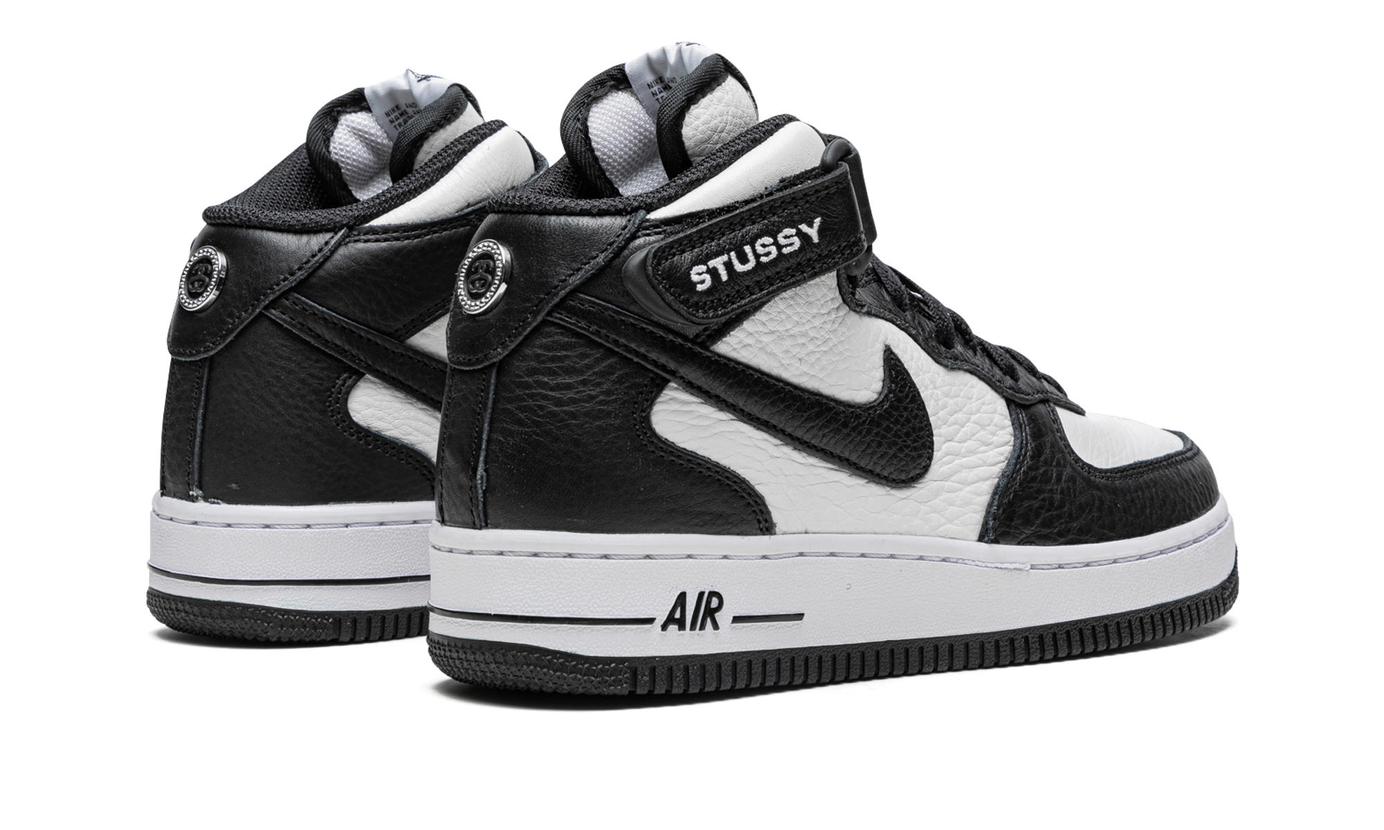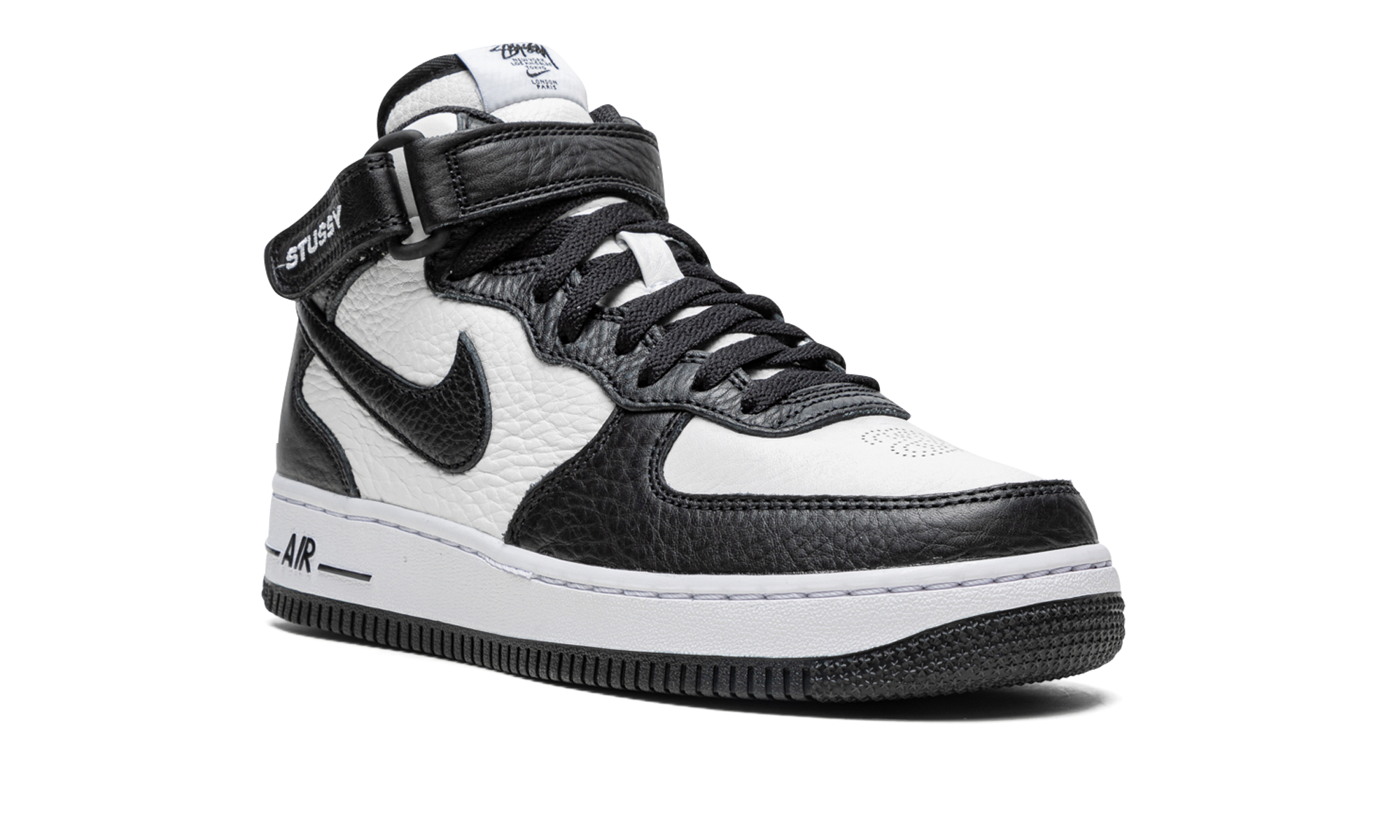 The Stussy x Nike Air Force 1 Mid “Light Bone/Black” is one of several colorways of the popular mid-top lifestyle shoe co-designed by the California based streetwear brand in May 2022. The Air Force 1 Mid “Light Bone/Black” is a desirable release by Stussy and Nike that succeeds the brand’s previous collaboration on the Air Force 1 from 2020. The design features a white leather base with black contrast leather overlays. The Swoosh logo on the sides is designed in black leather with a reptilian pattern. Classic “Stussy” branding is embroidered on the side of the adjustable black leather ankle strap. Stussy’s interlocking “SS” detailing is found on the heel. Additionally, Stussy’s “worldwide” branding, including a list of the cities the brand has retail locations in, is printed on the tongue tag. Dotted “SS” detailing is found on the toe. Release date: May 13, 2022 Stussy - Light Bone Black
