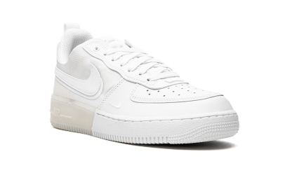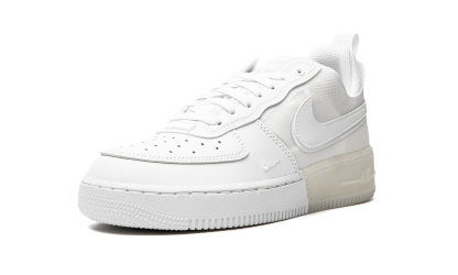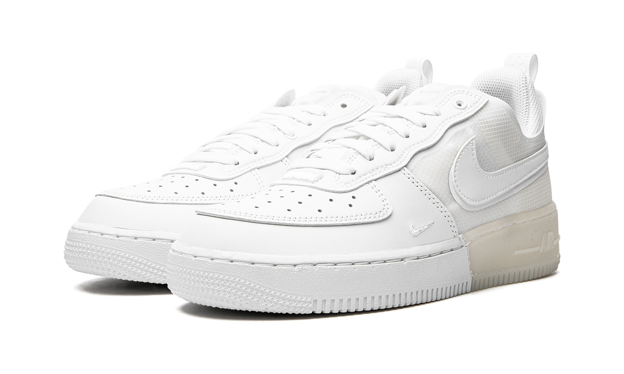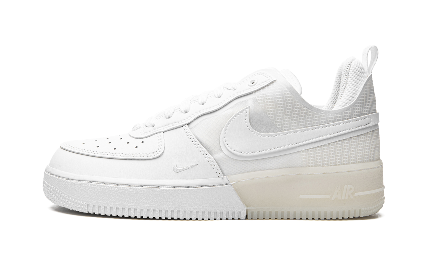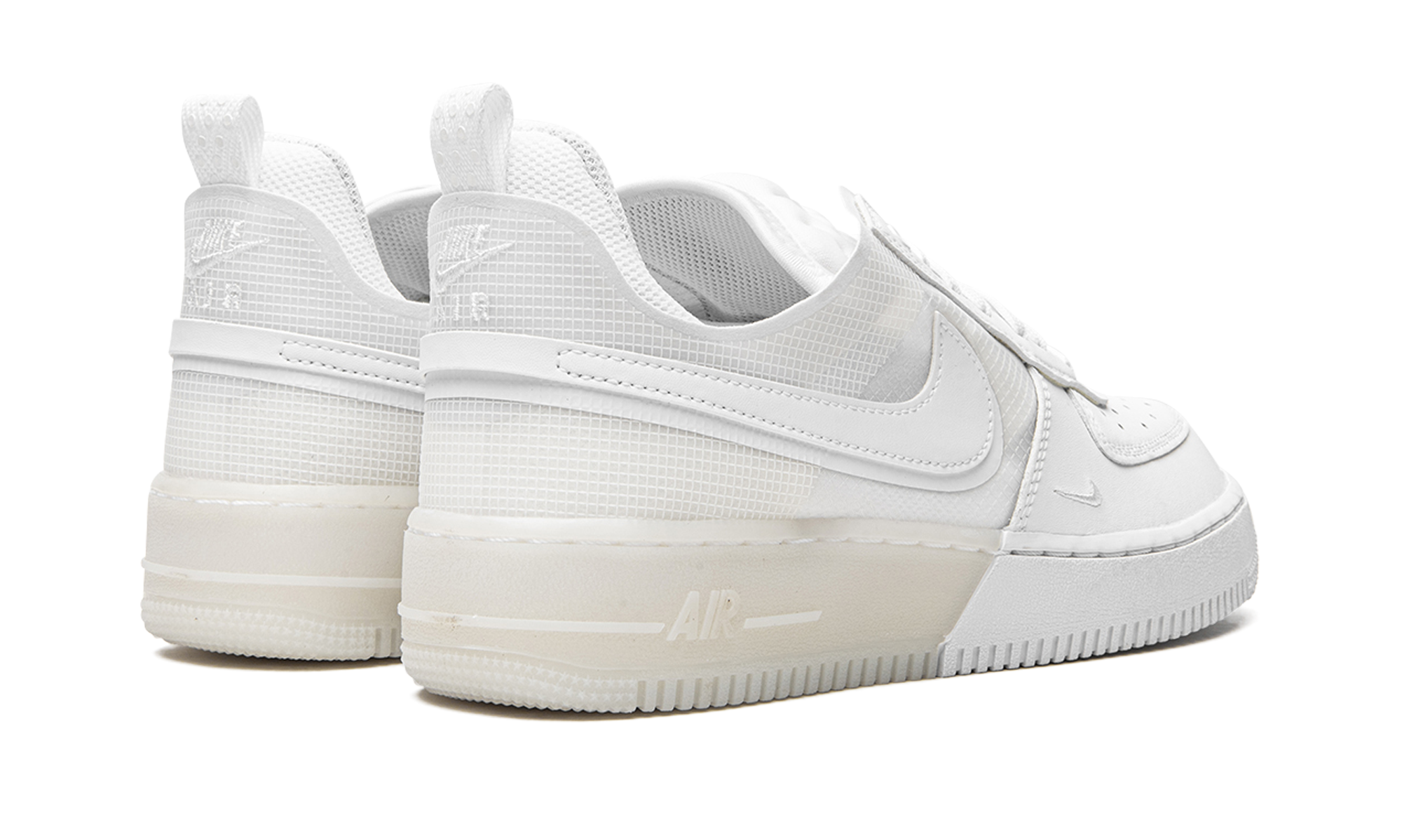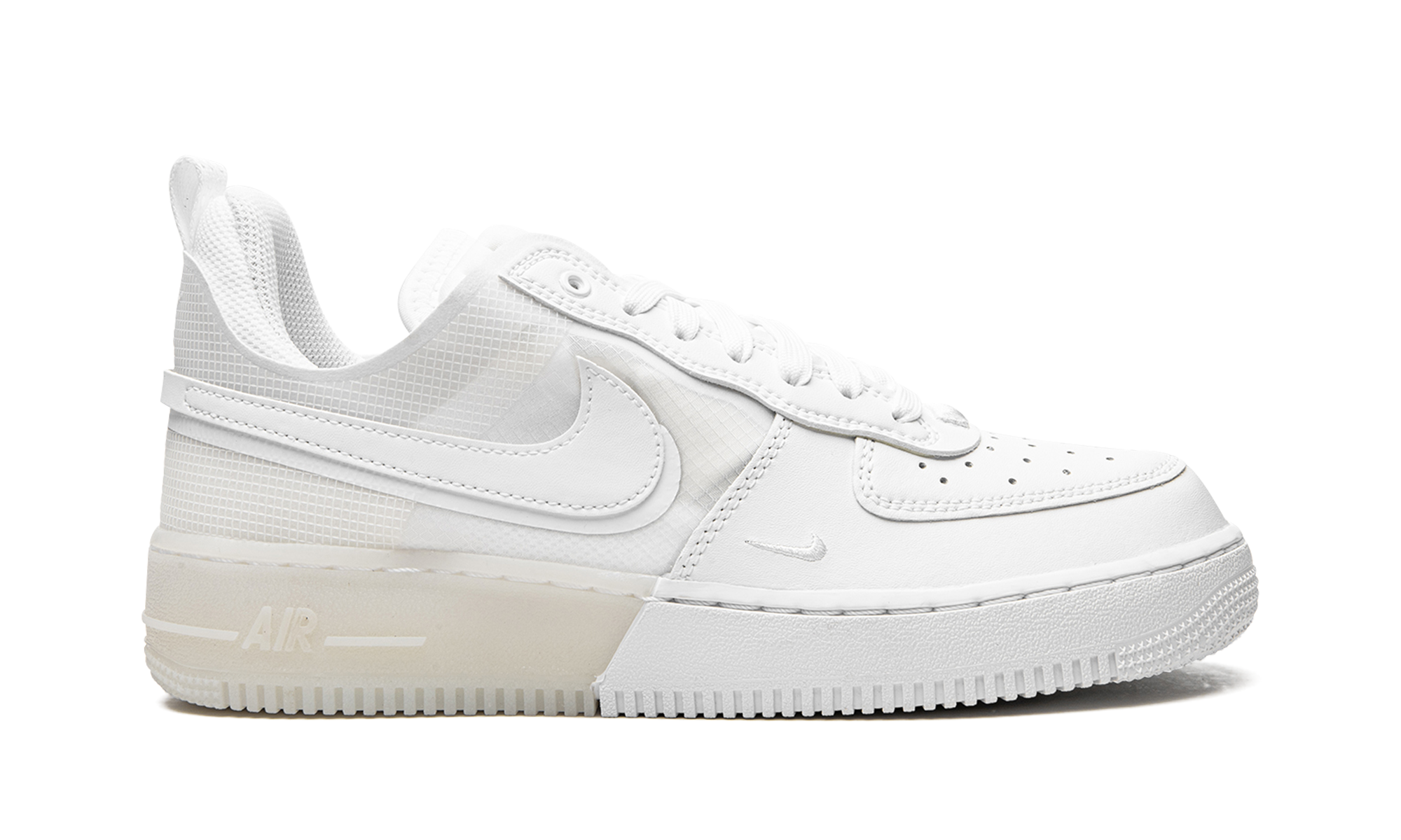 The Nike Air Force 1 React “Triple White” is an intriguing version of the retro basketball shoe with a futuristic appearance. In the Air Force 1 React model, the venerable retro basketball shoe receives a makeover that puts comfort and versatility at the forefront of its design. The front half of the shoe features a classic white leather construction that pays homage to the Air Force 1’s original design. The back portion of the shoe champions a futuristic vibe with semi-translucent ripstop paneling. Layered white leather Swooshes appear on both sides of the shoe. Underfoot, Nike combines its signature Air cushioning technology in the forefoot of the midsole with React foam cushioning in the heel. Triple White
