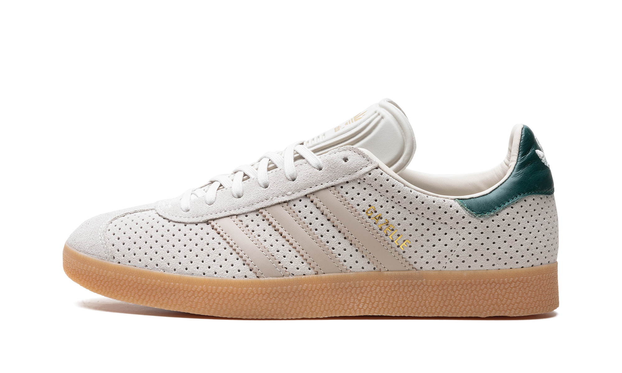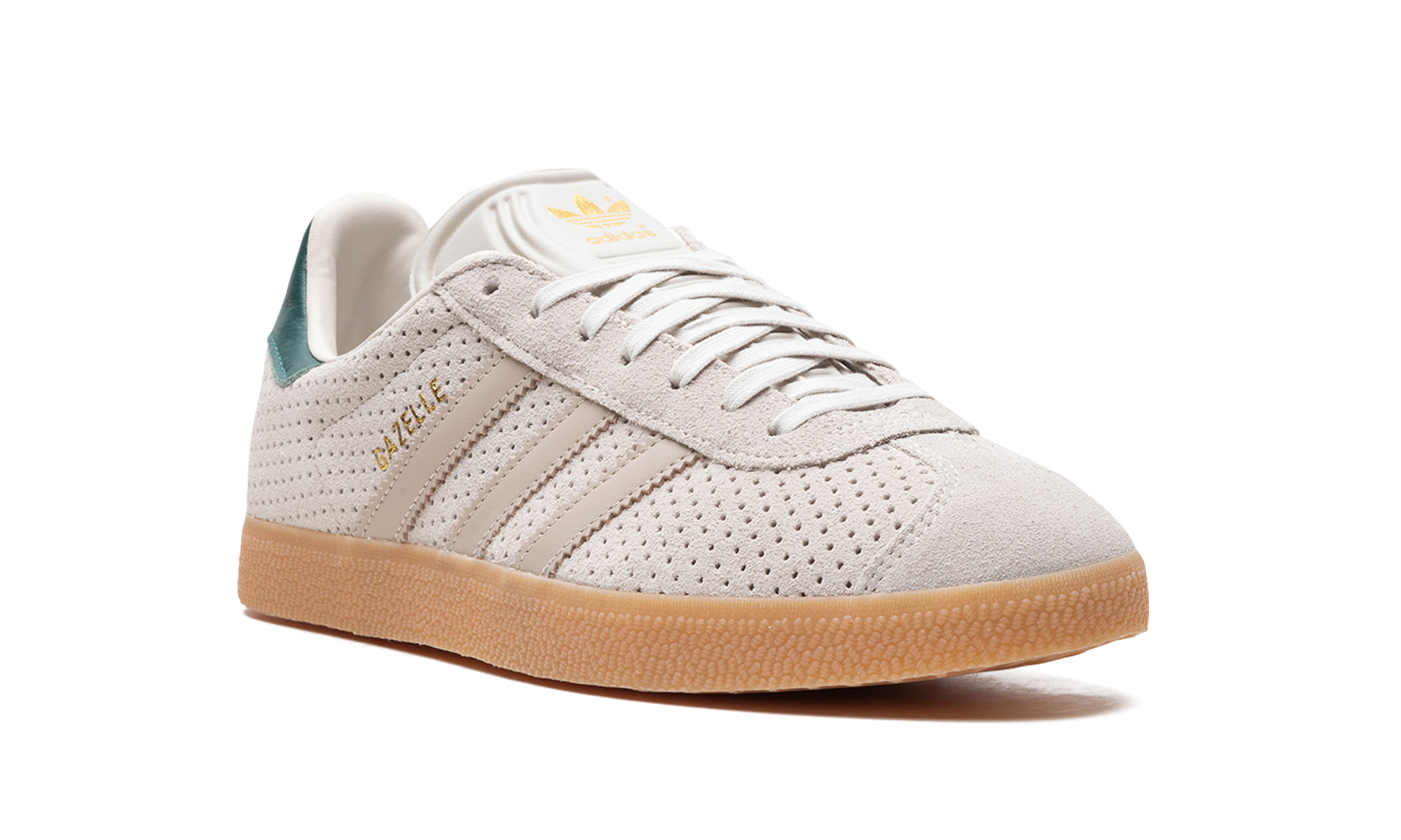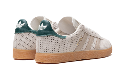 The adidas Gazelle “Aluminum/Collegiate Green” is a colorway of the retro shoe with unique details. The “Aluminum/Collegiate Green” features a perforated Aluminum-colored leather upper with Wonder Beige leather Three Stripes branding on the sides. Gold “Gazelle” detailing appears on the lateral side of the mid-panel. The Collegiate Green leather heel tab has a classic “adidas” Trefoil logo. More “adidas” insignia appears on the tongue. A gum sole completes the look.
