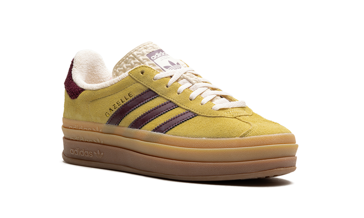 The Women’s adidas Gazelle Bold “Yellow/Burgundy” is a women’s-exclusive colorway of the retro shoe with a platform-style sole and other modifications. The contemporary-looking adidas Gazelle Bold features a triple-stacked, raised sole. As for the rest of the design, the shoe features a mustard yellow suede upper with burgundy leather Three Stripes on the sides. Gold “Gazelle” branding is seen on the lateral side of the shoe. The burgundy terry cloth heel tab matches the material used on the shoe’s inner lining. A stacked gum rubber sole completes the look.