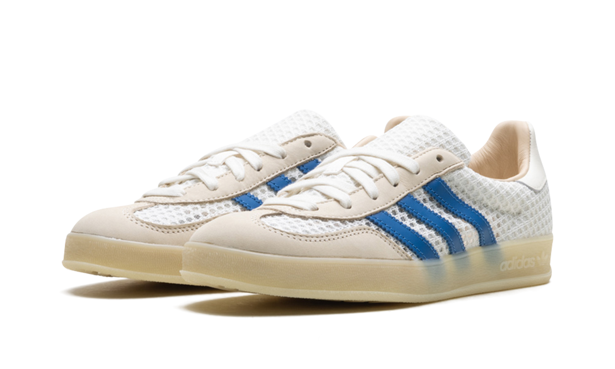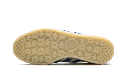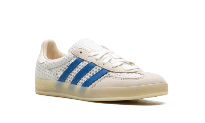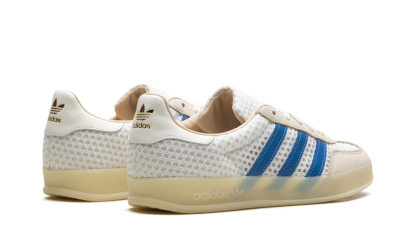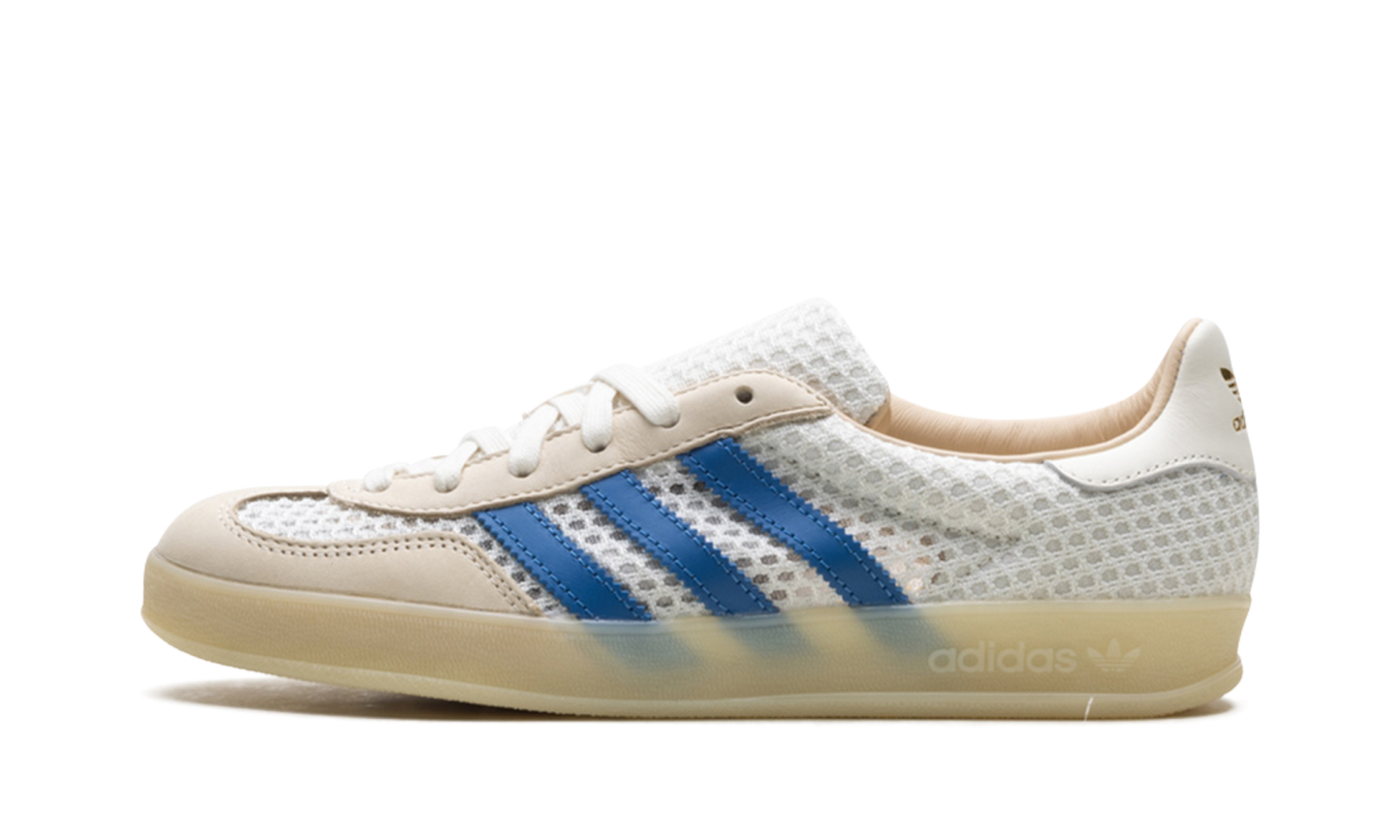 Elevate your casual look with the adidas Gazelle Indoor "Off White Focus Blue" sneaker! This classic shoe, originally designed for indoor training, features a unique and highly breathable wide-hole mono mesh upper in a crisp Off White hue. It's accented by structural overlays and the signature 3-Stripes in vibrant Focus Blue and Warm Vanilla for an eye-catching contrast. The translucent gum rubber outsole stays true to its vintage heritage, ensuring both classic style and excellent grip.