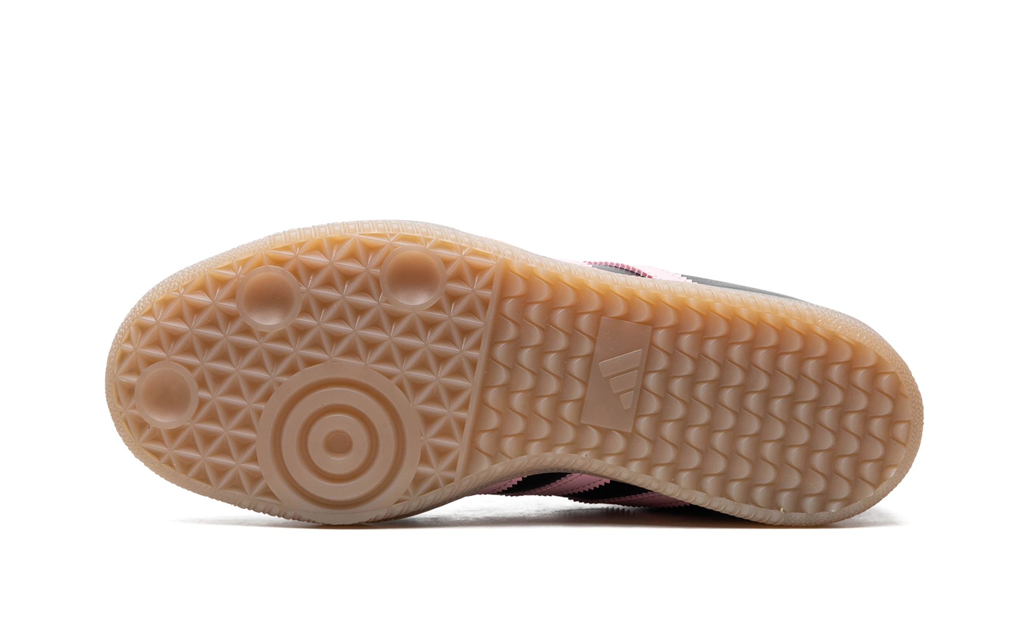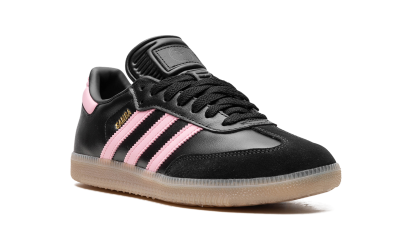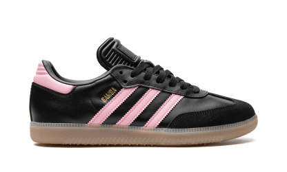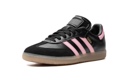 The adidas Samba OG “Inter Miami - Black” is a colorway of the popular retro shoe inspired by the Major League Soccer team. Also said to be inspired by Inter Miami’s star player, football (soccer) legend Lionel Messi, the “Inter Miami” features the colors of the Miami-based team on its design. The upper has a black leather construction with pink leather Three Stripes branding. A gold “Samba” logo appears on the lateral side of the mid-panel, while detailing inspired by Inter Miami is located on the tongue. A semi-translucent, smoky Gum rubber sole completes the look.