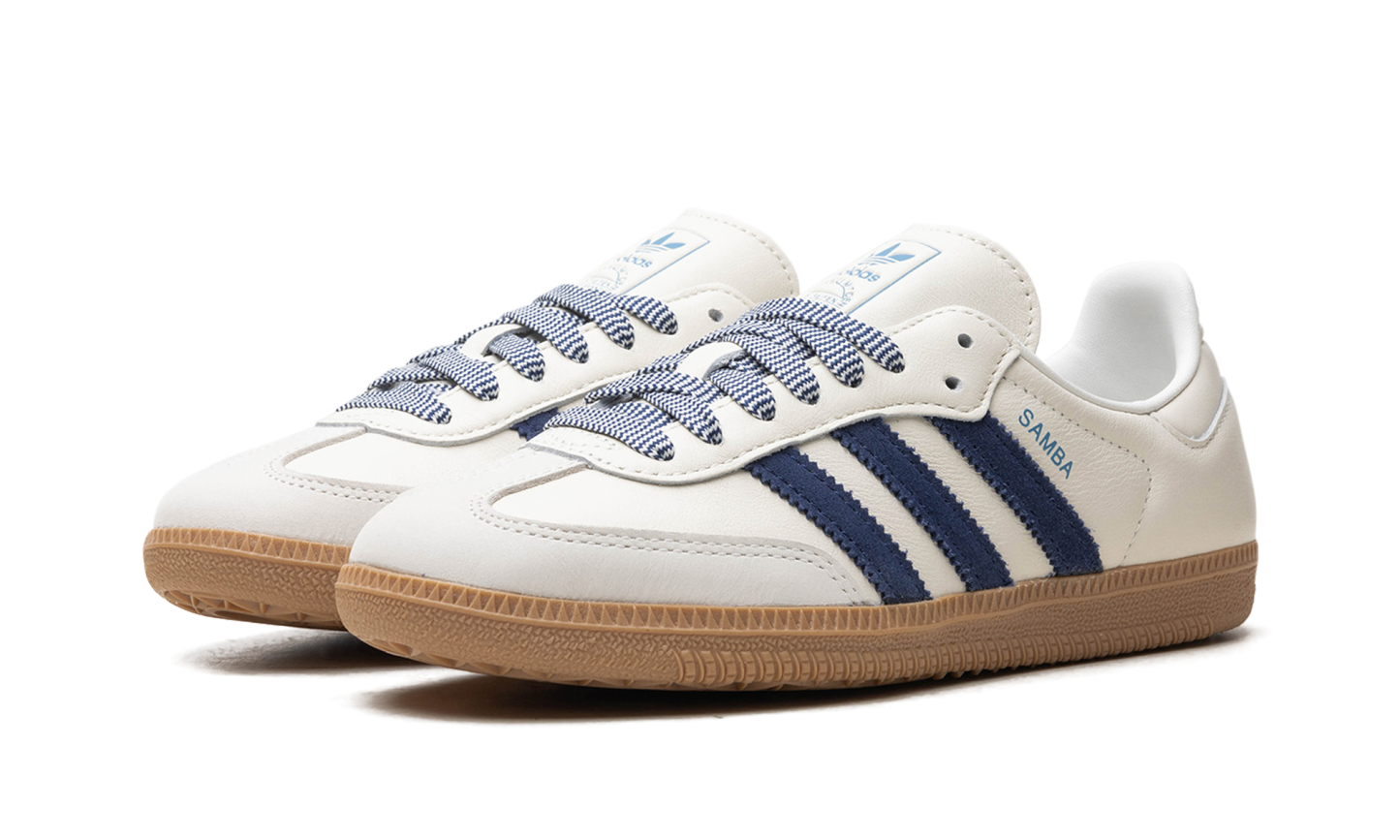 Elevate your everyday style with the Adidas Samba OG "Off White / Dark Blue." This classic silhouette features a stylish combination of off-white and dark blue. The clean off-white upper is complemented by the rich dark blue accents, creating a versatile and sophisticated take on a sporty icon.