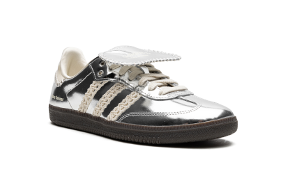 The Wales Bonner x adidas Samba “Silver” is a collaboration by the fashion designer and adidas on the popular sneaker with design elements inspired by its soccer roots. Certainly no strangers to one another, Grace Wales Bonner and adidas have collaborated on numerous occasions since 2020, and their partnership continues to evolve here on the “Silver” Samba. The shoe features a shiny, reflective-like Chrome leather construction with off-white-colored rope Three Stripes stitching on the sides. The same rope-style stitching also appears along the cream leather heel tab overlay. A “Wales Bonner” logo is found on the lateral side of the heel. The shoe’s fold-over tongue is a nod to the model’s original appearance. A dark gum rubber sole completes the look.