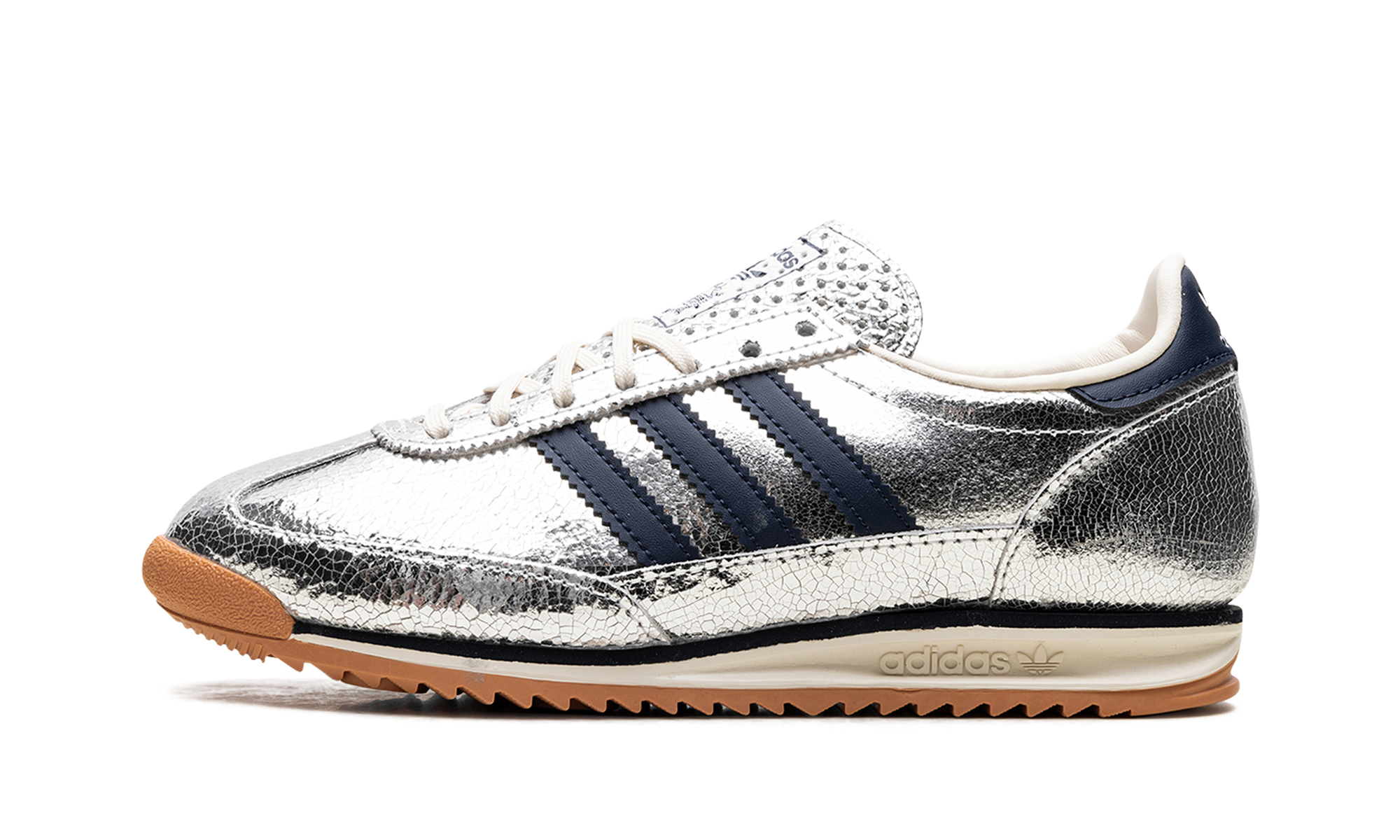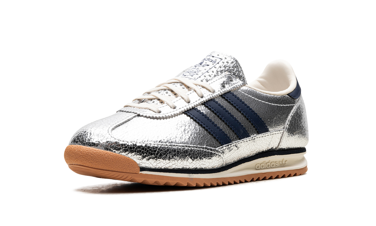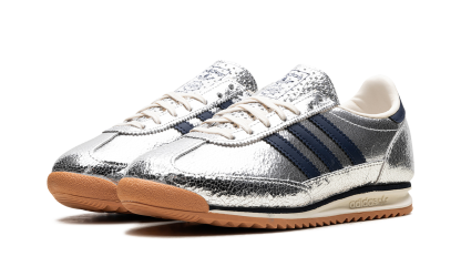 Step into retro-futuristic style with the Adidas SL 72 "Silver Metallic Collegiate Navy." This design features a bold silver metallic upper contrasted with classic Collegiate Navy accents. A unique blend of vintage inspiration and modern flair.