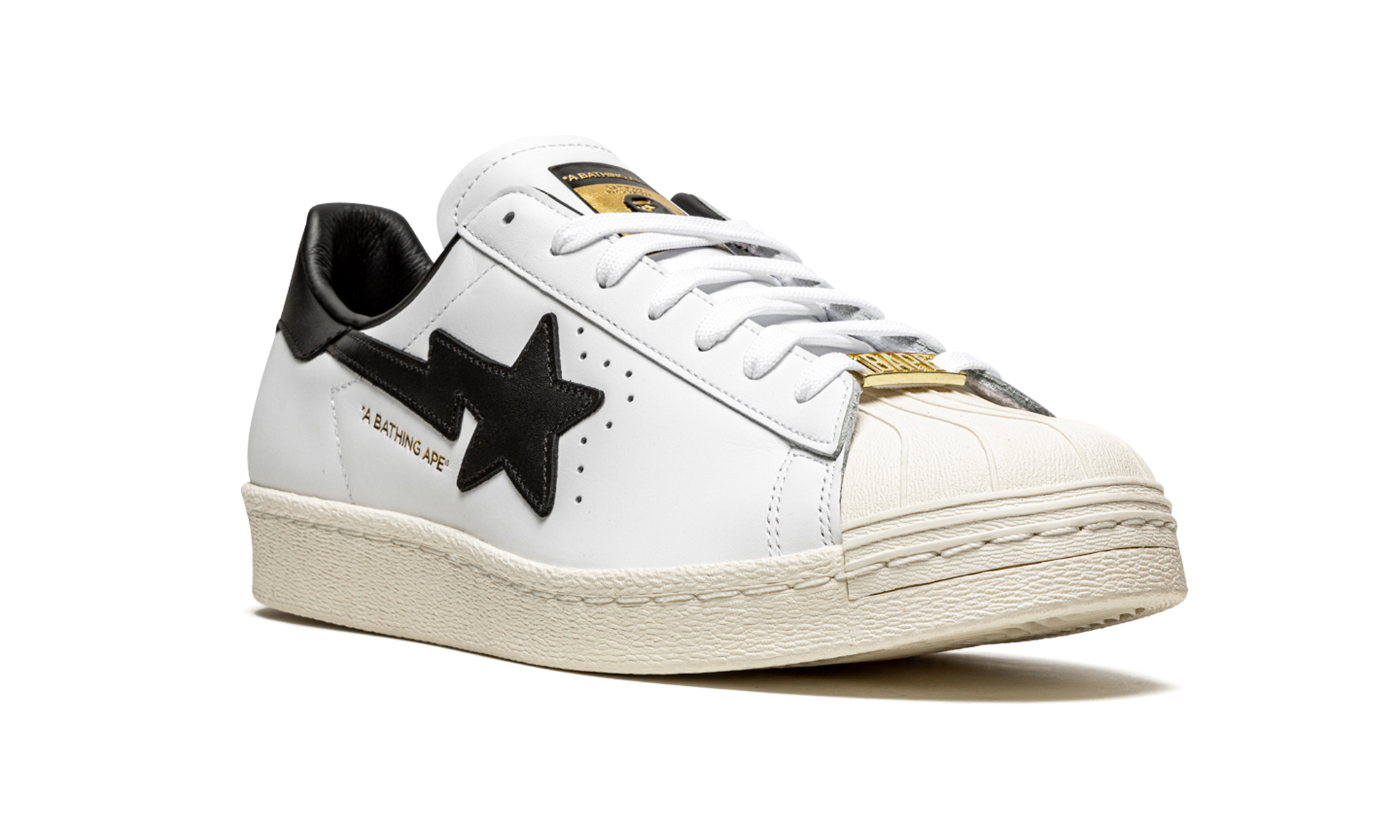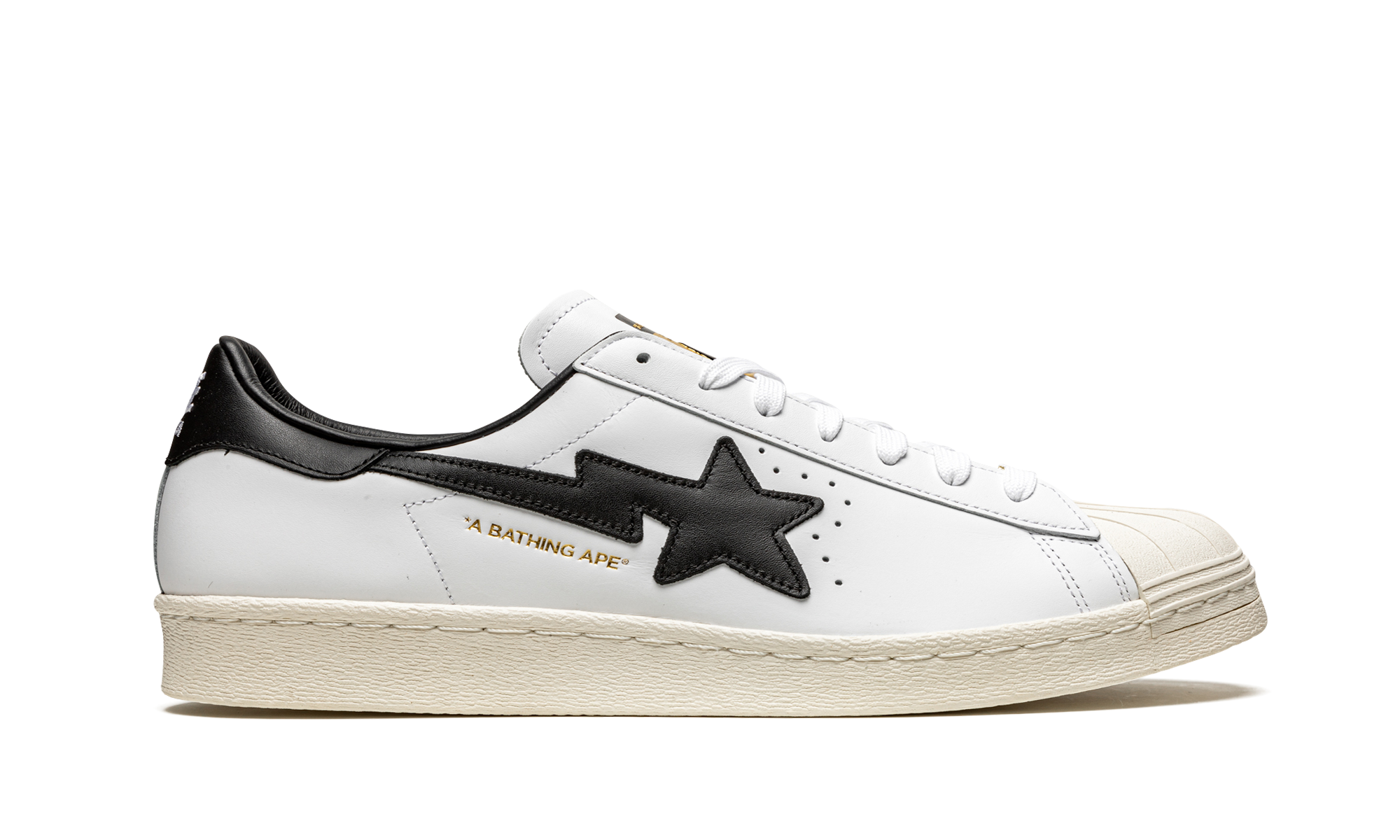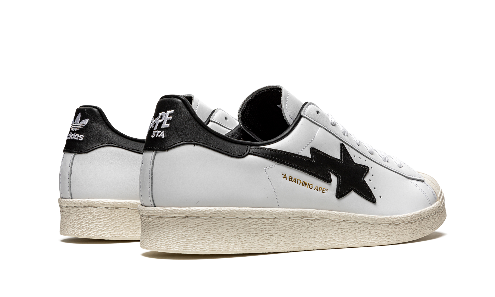 The Superstar 80S 'BAPE - White / Black' shoe features a classic Adidas Superstar style with a unique BAPE white and black design.