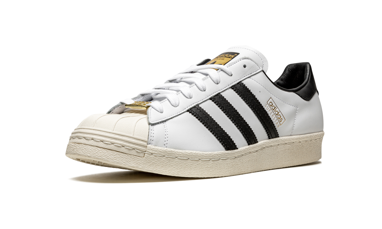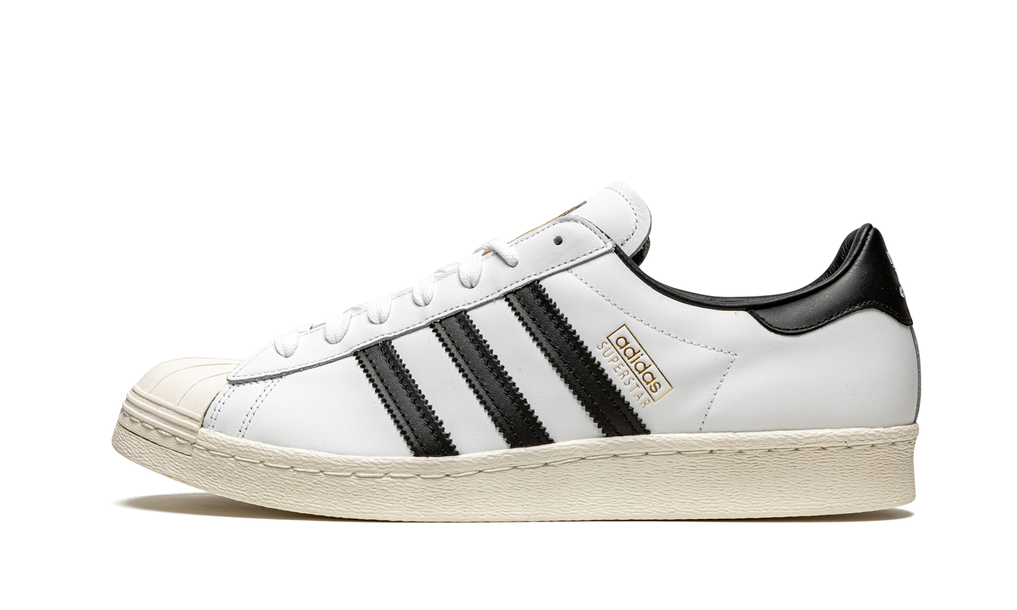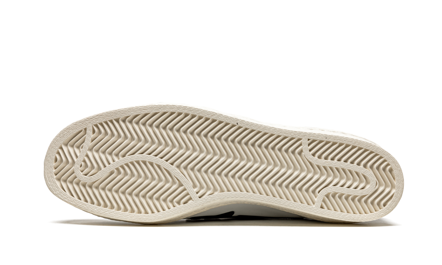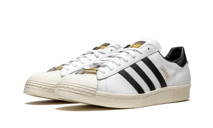 The Superstar 80S 'BAPE - White / Black' shoe features a classic Adidas Superstar style with a unique BAPE white and black design.