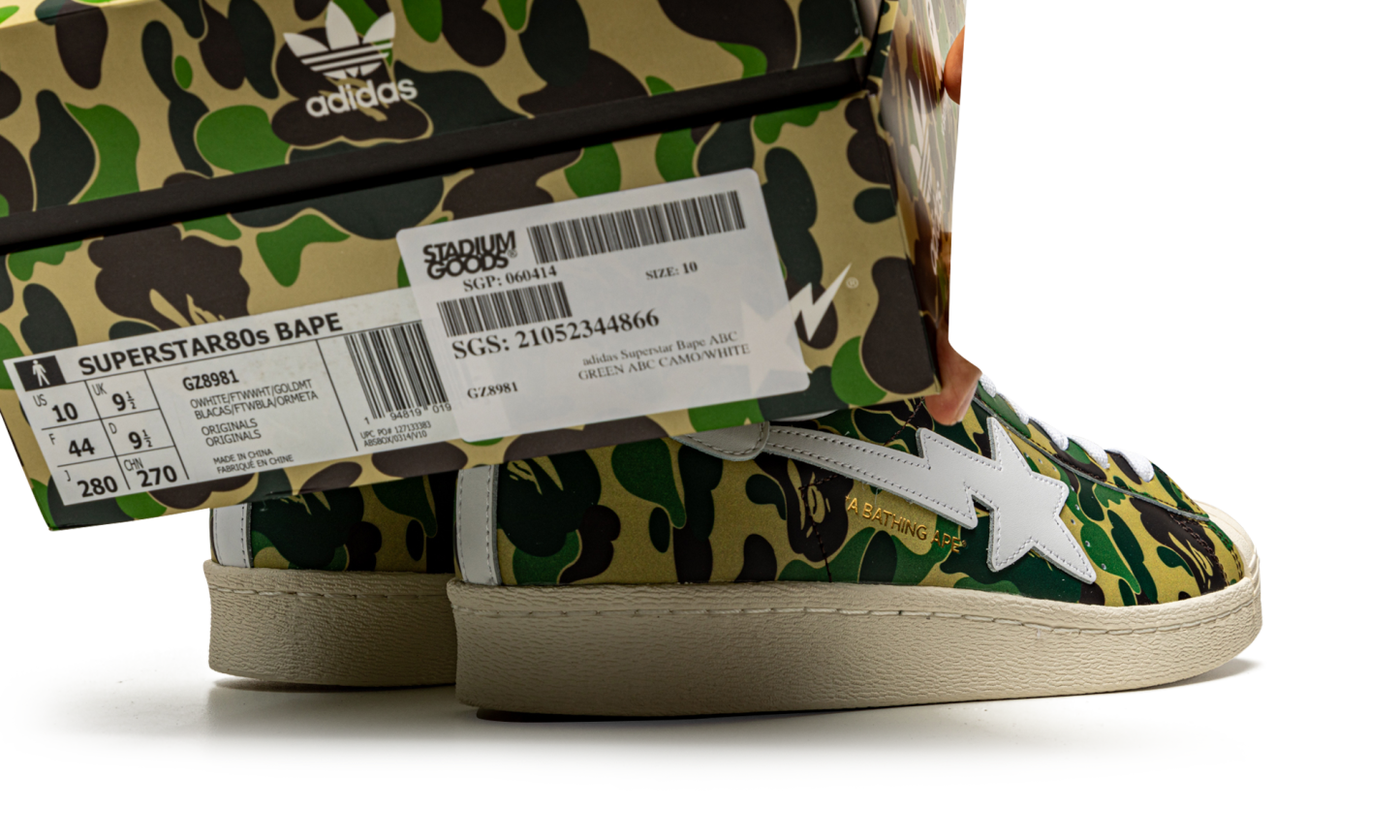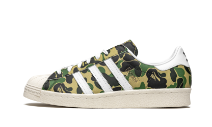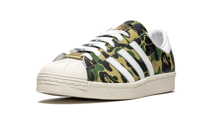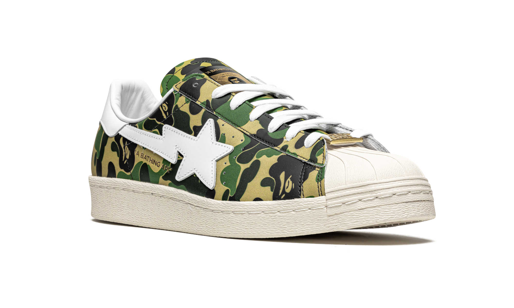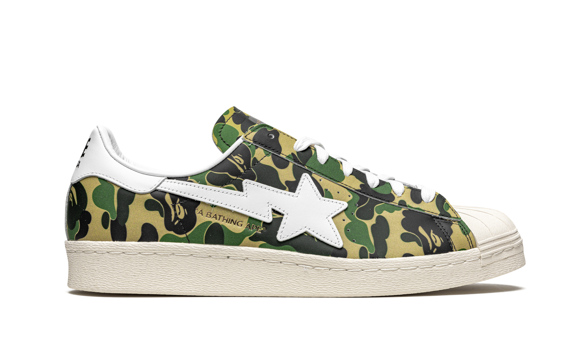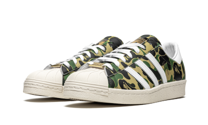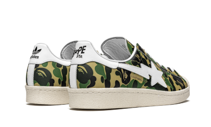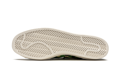 The Superstar 'BAPE - Green Camo' shoe features a classic Adidas Superstar style with a unique BAPE green camouflage print, offering a bold and distinctive look.