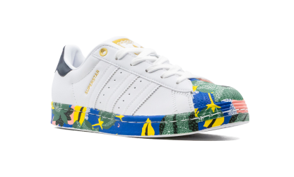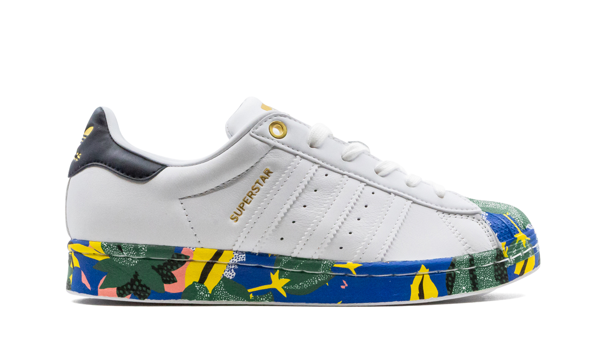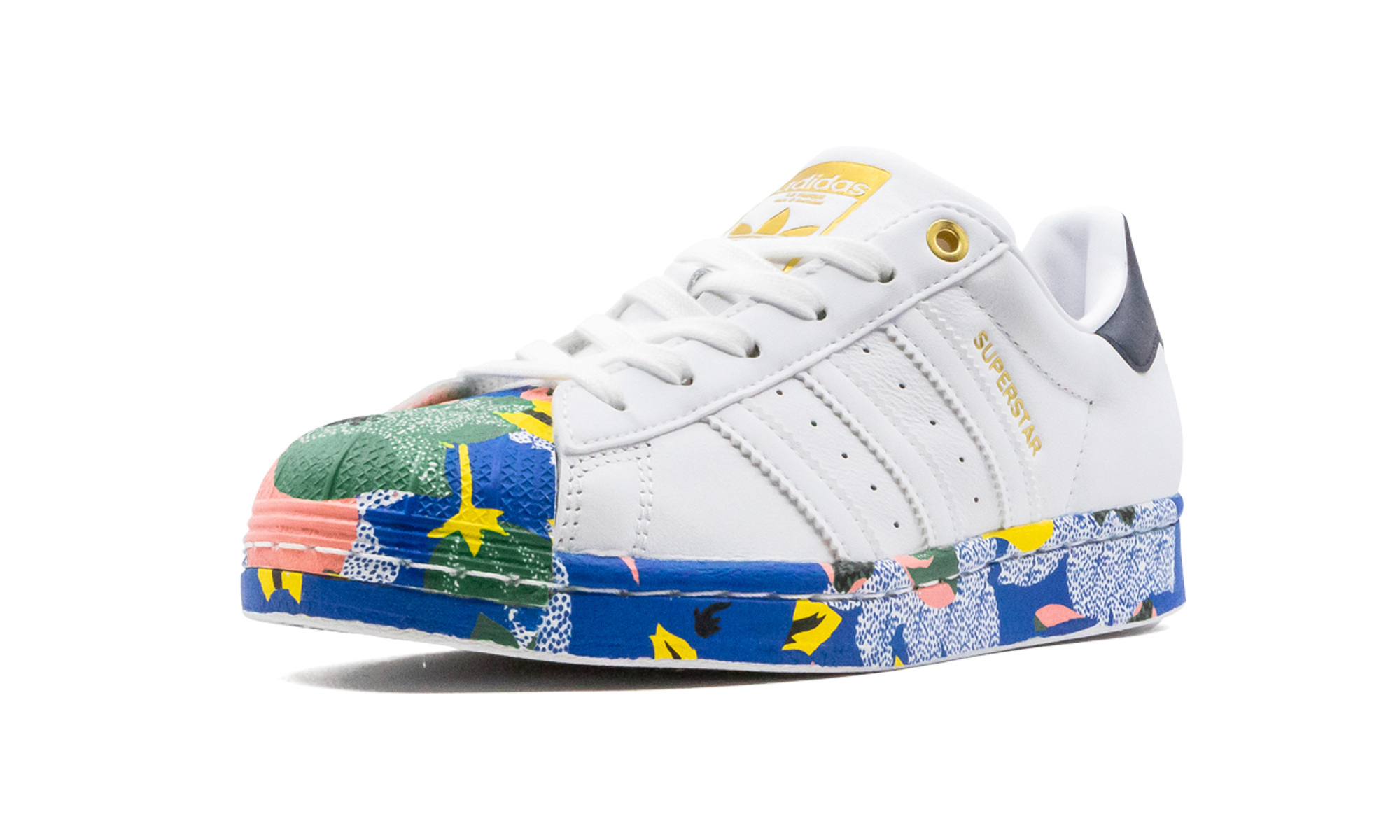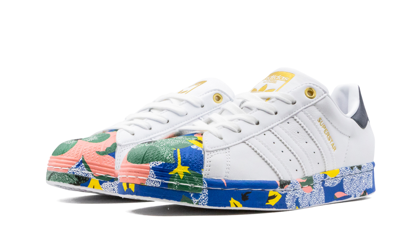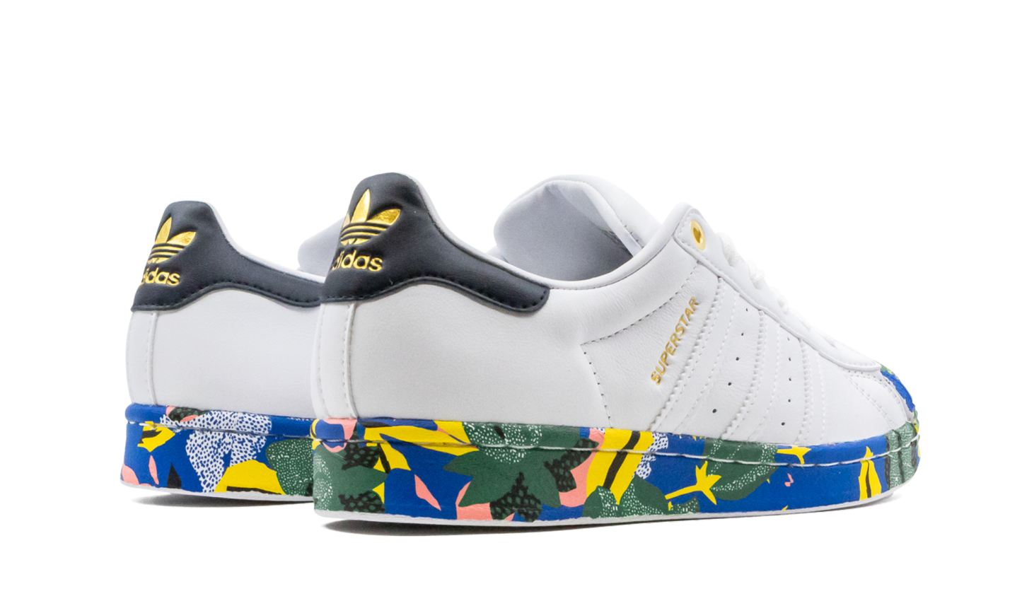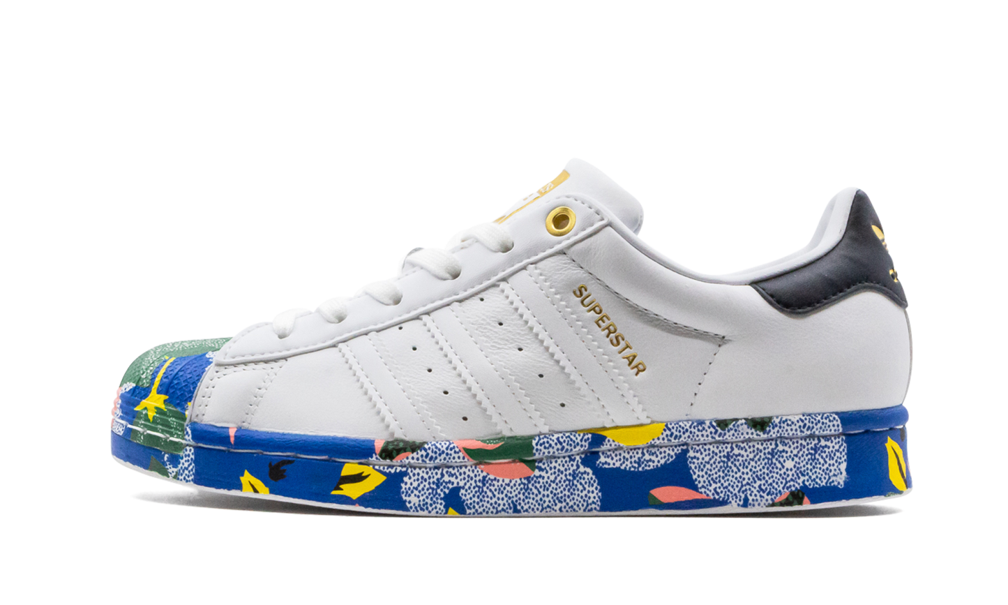 The Superstar 'HER STUDIO LONDON' shoe features a design in collaboration with HER STUDIO LONDON, offering a vibrant and artistic take on the classic Superstar silhouette.