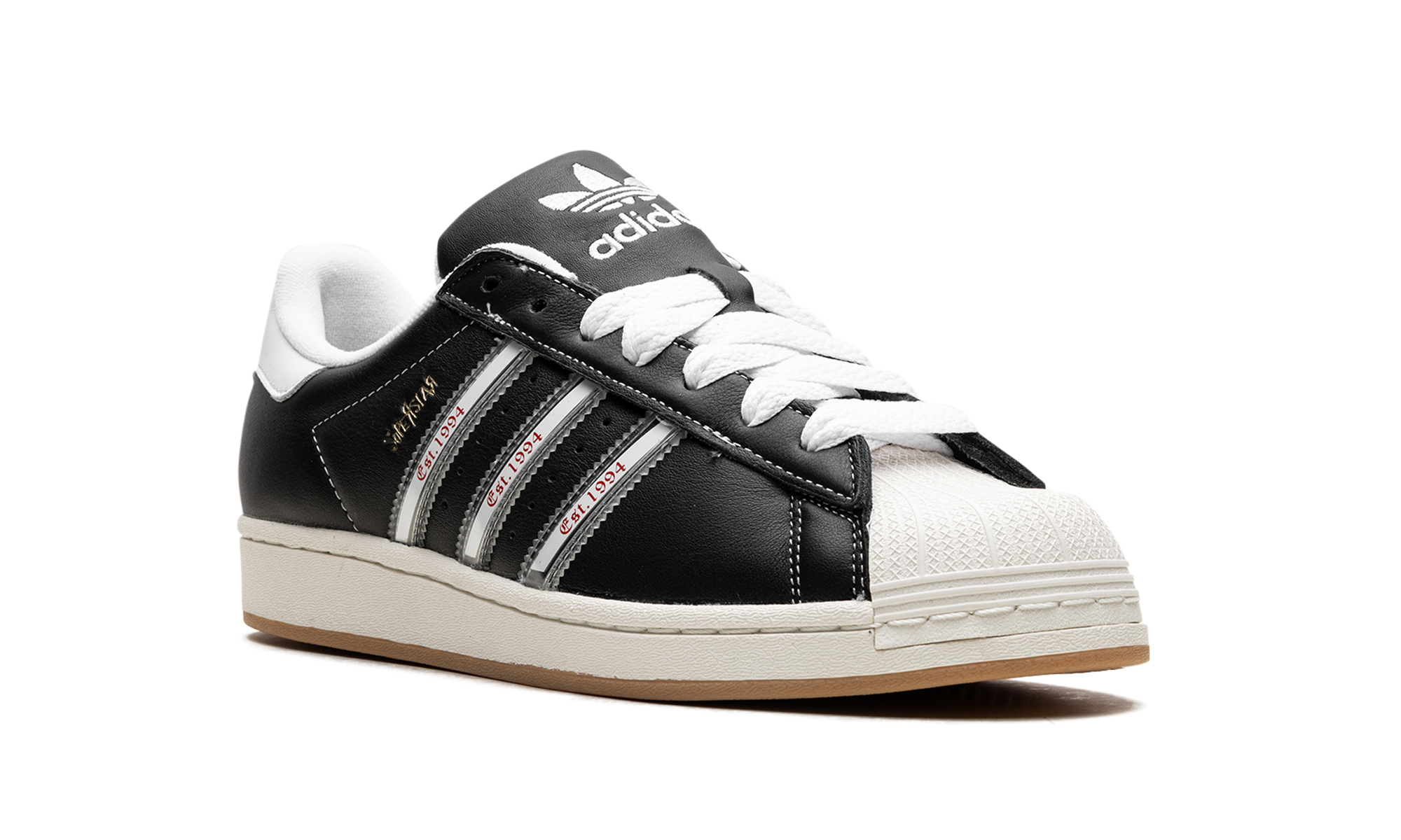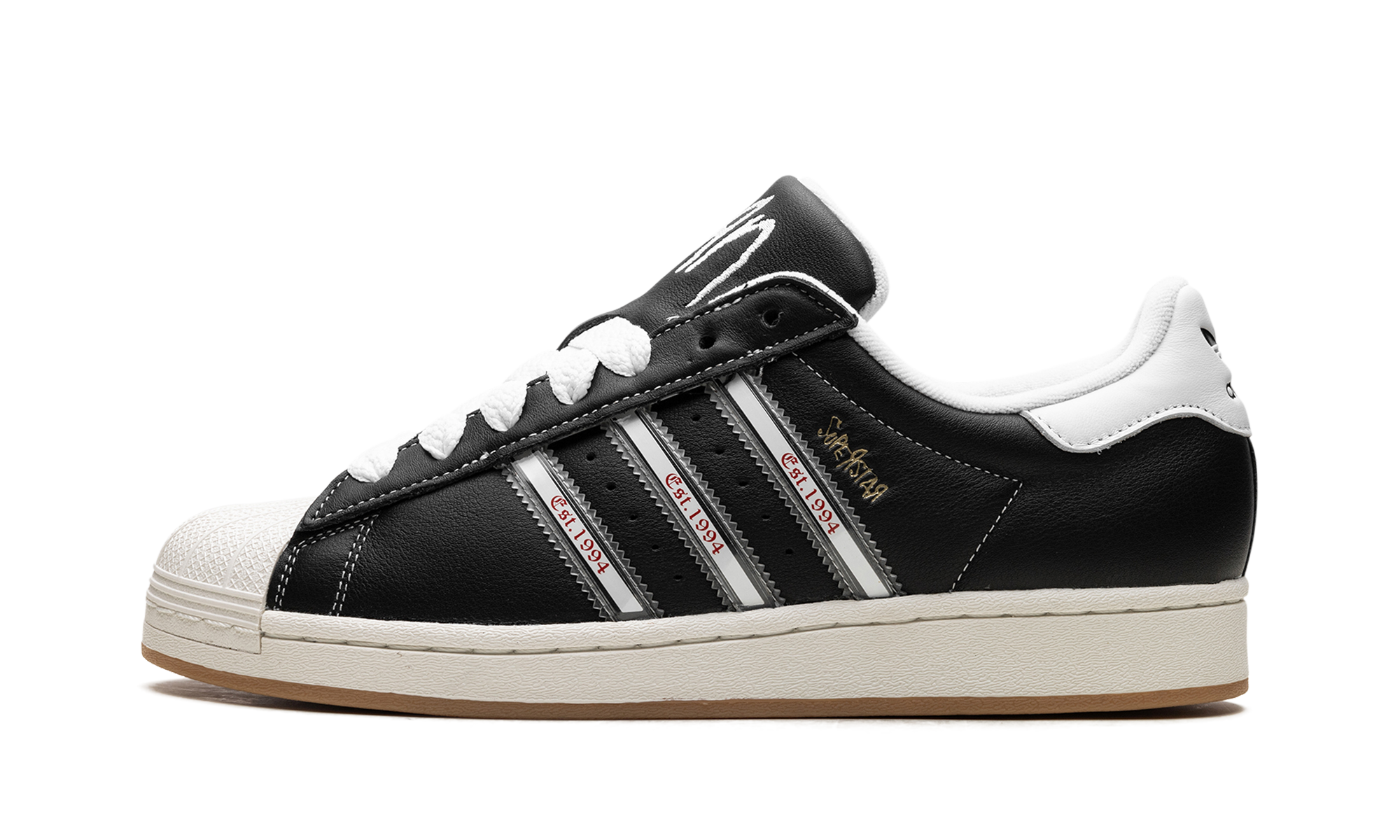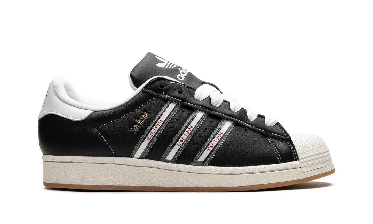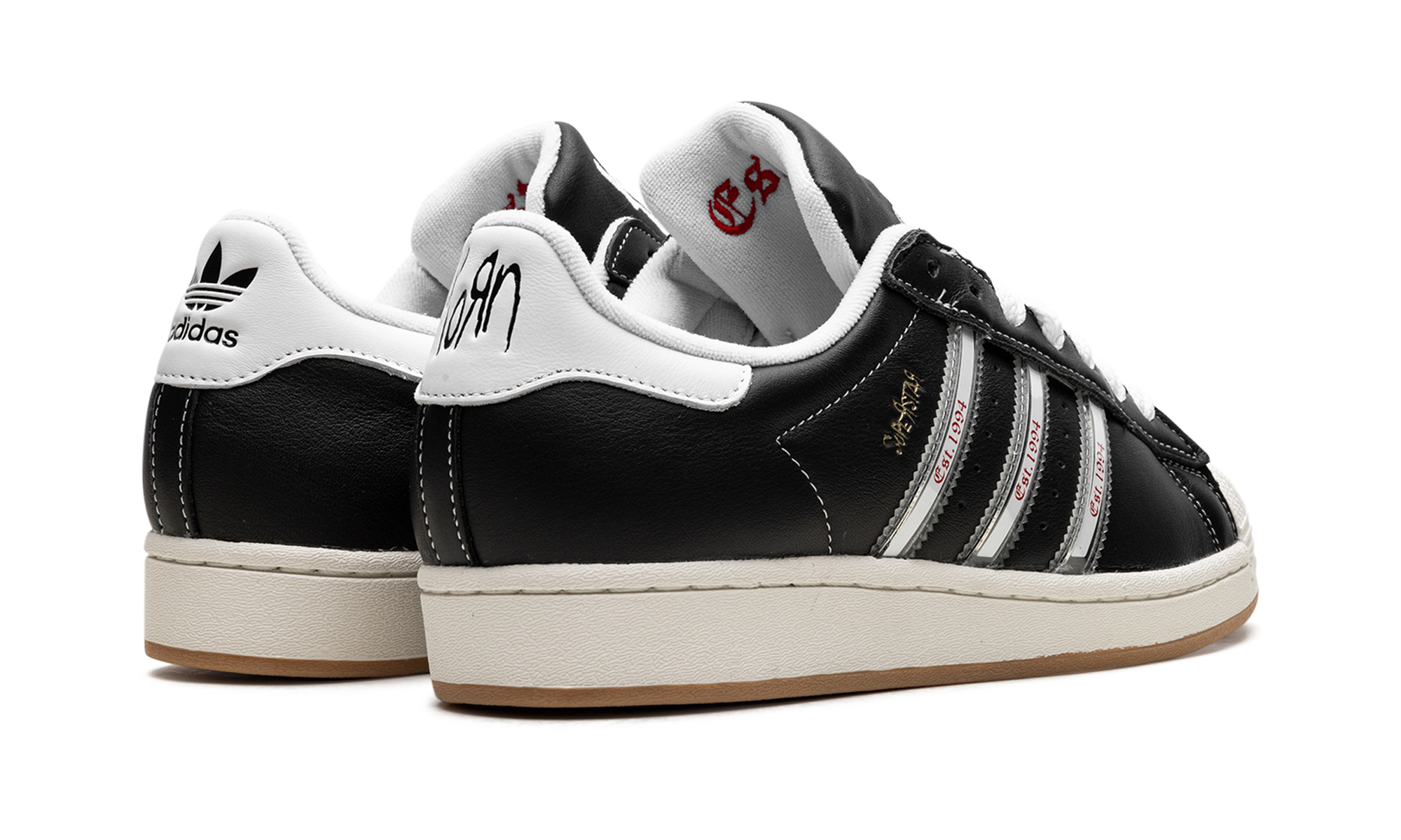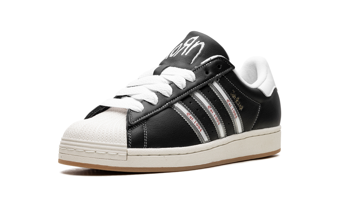 The Superstar 'Korn - 30th Anniversary' shoe celebrates three decades of the iconic band Korn, blending classic Adidas Superstar style with unique design elements inspired by their legacy.