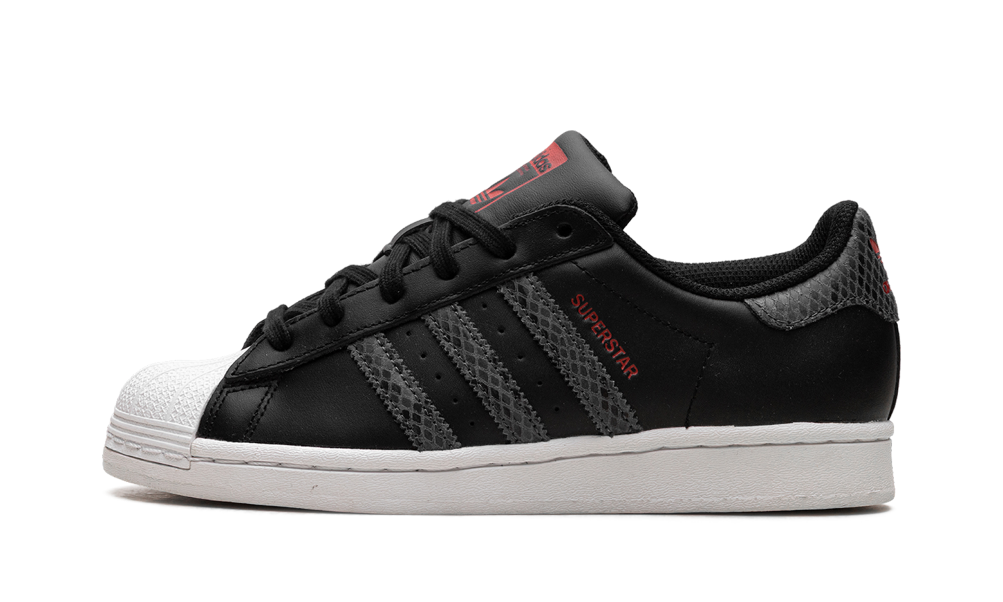 The Superstar WMNS 'Black' shoe features a classic design in an all-black colorway, making it a versatile and timeless addition to any sneaker collection.