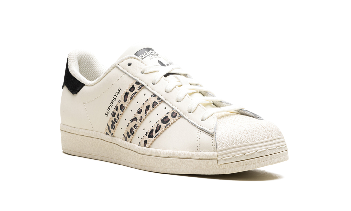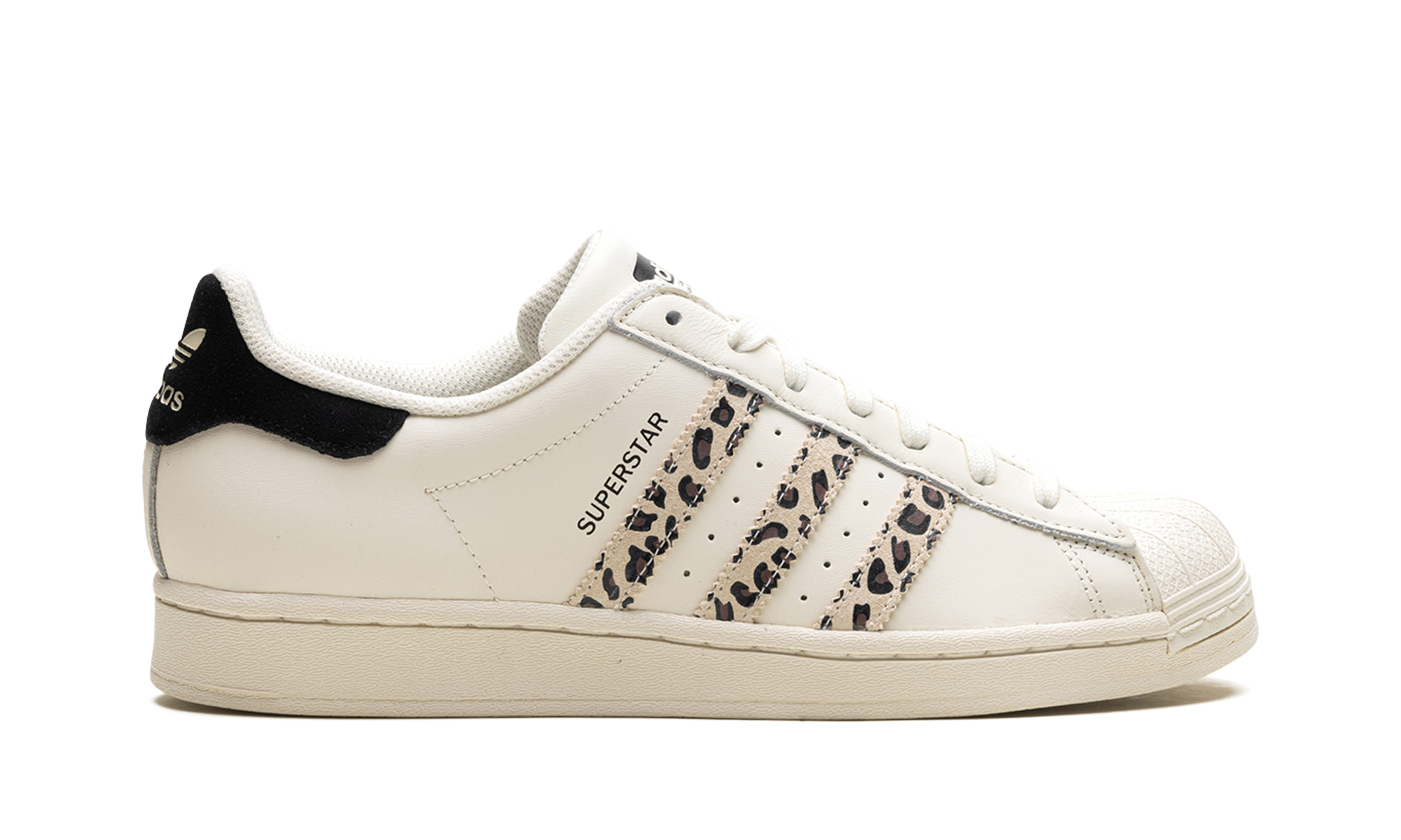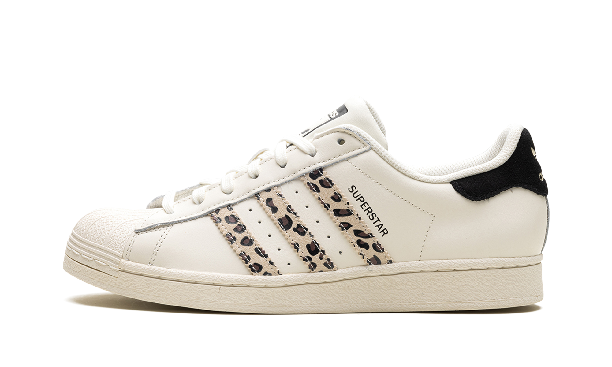 The Superstar WMNS 'Off White Black Leopard' shoe features a classic design with a bold leopard print, offering a versatile and stylish addition to any sneaker collection.