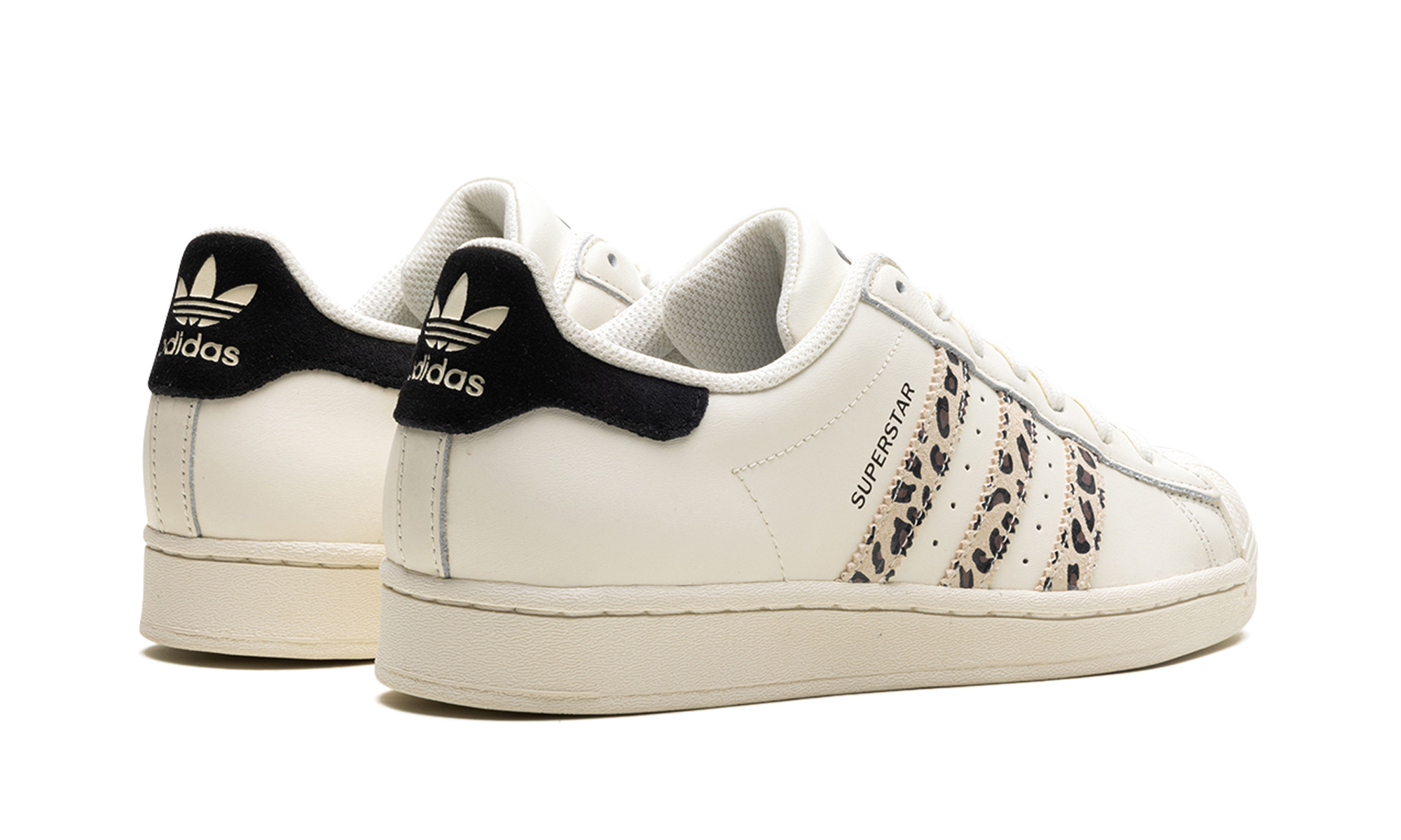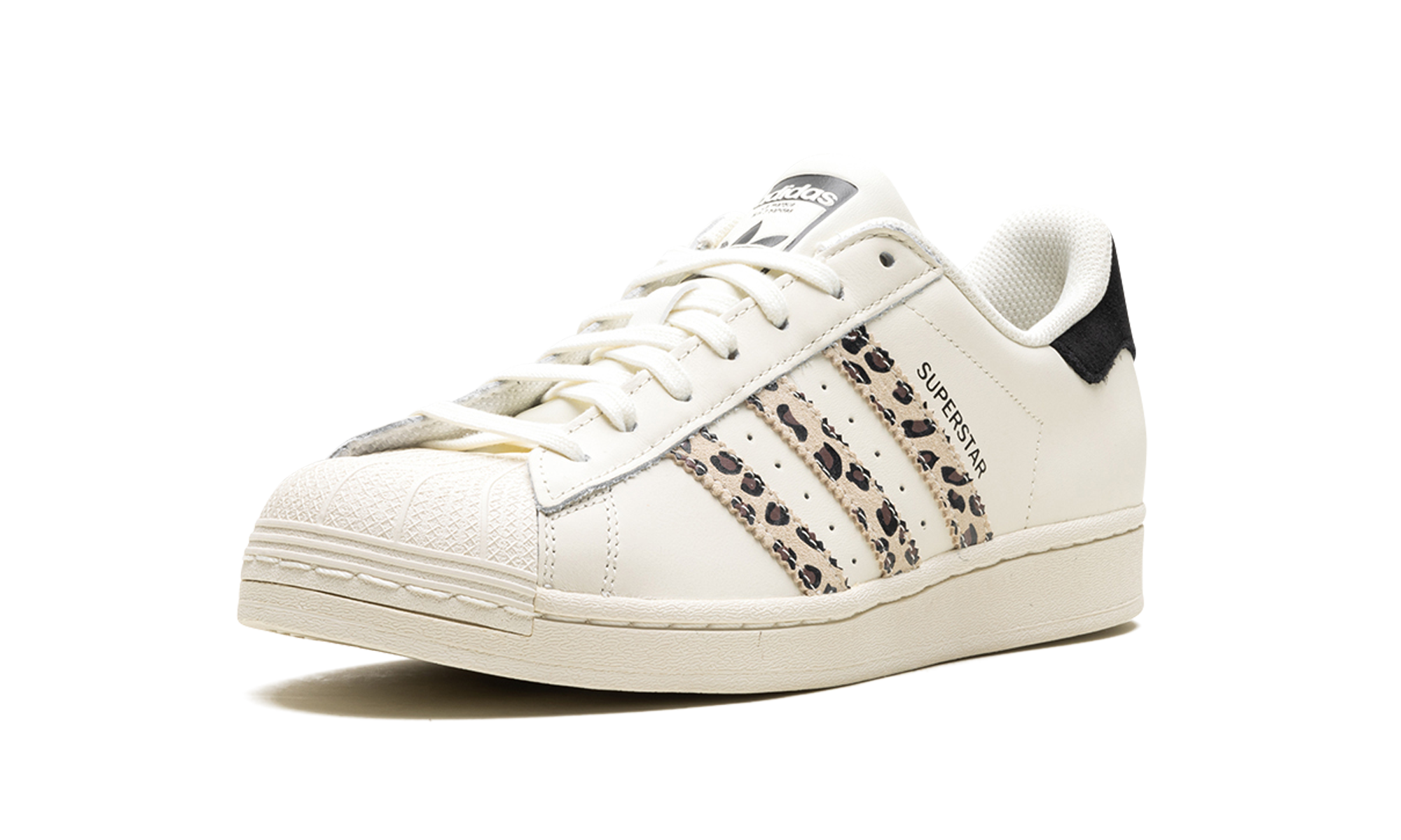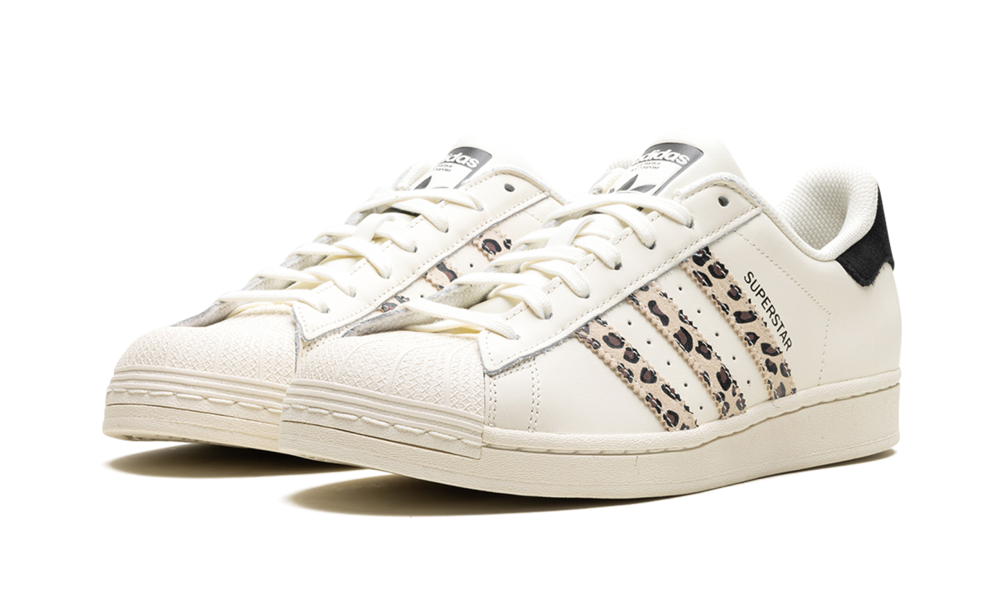 The Superstar WMNS 'Off White Black Leopard' shoe features a classic design with a bold leopard print, offering a versatile and stylish addition to any sneaker collection.