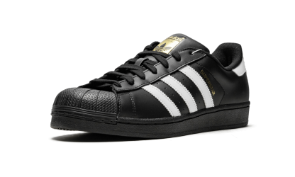 The Superstar Foundation 'Black/White' shoe features a classic two-tone design, offering a versatile and timeless addition to any sneaker collection.