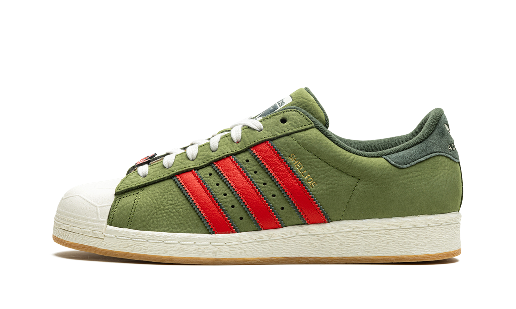 The Superstar 'Teenage Mutant Ninja Turtles - Shelltoes' shoe features a design inspired by the iconic cartoon, blending classic Adidas Superstar style with unique Teenage Mutant Ninja Turtles details on the shell toe.